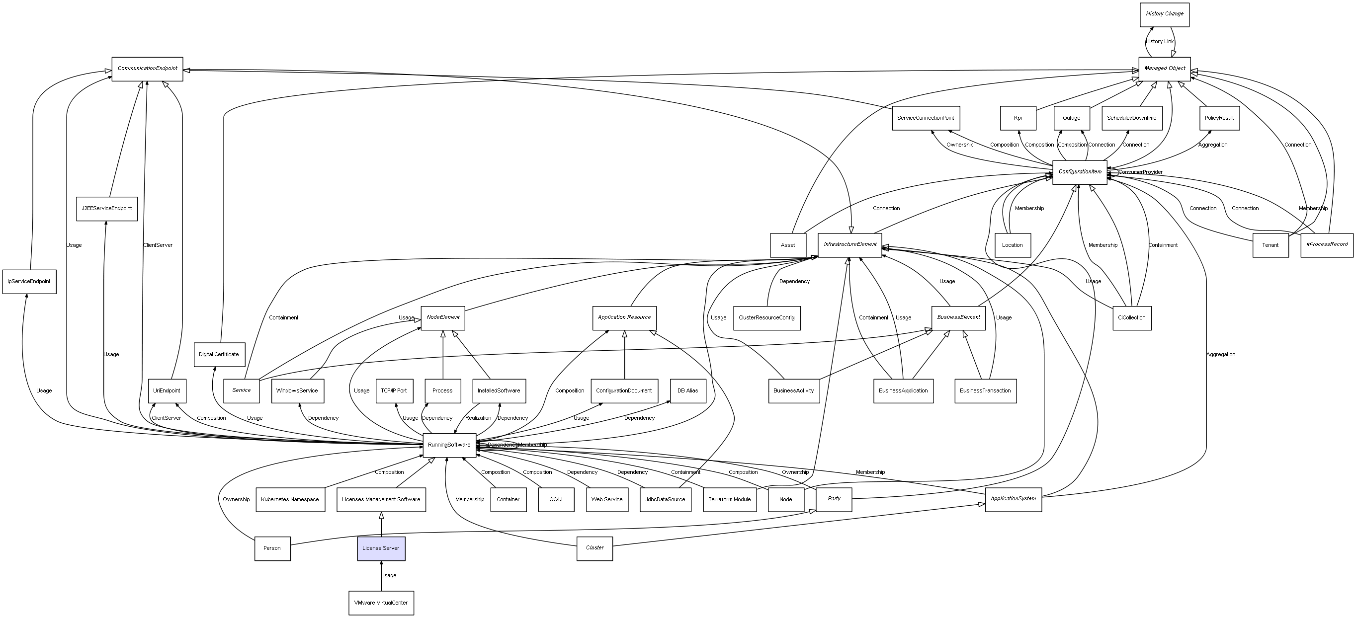 | ConfigurationItem | ServiceConnectionPoint | Composition | Represents a relation between 2 objects where one is contained within the other, and the included object can not exist without its container. Therefore, when the container is deleted, all its contained object will be automatically removed |