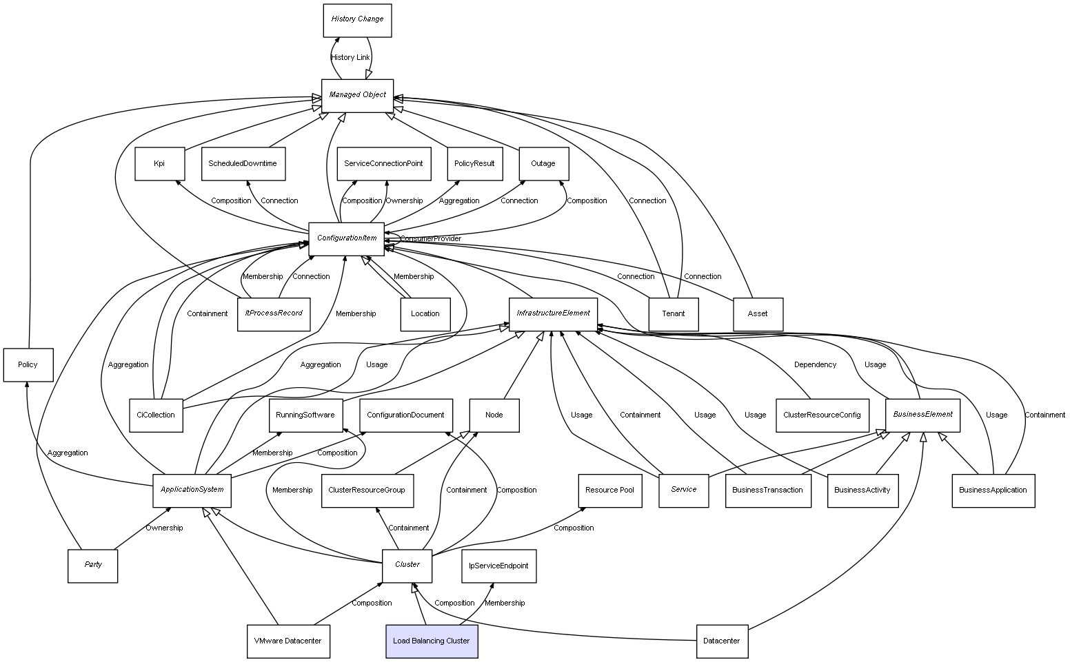 | VMware Datacenter | Cluster | Composition | Represents a relation between 2 objects where one is contained within the other, and the included object can not exist without its container. Therefore, when the container is deleted, all its contained object will be automatically removed |