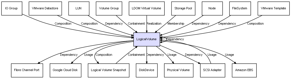 | VMware Datastore | LogicalVolume | Composition | Represents a relation between 2 objects where one is contained within the other, and the included object can not exist without its container. Therefore, when the container is deleted, all its contained object will be automatically removed |