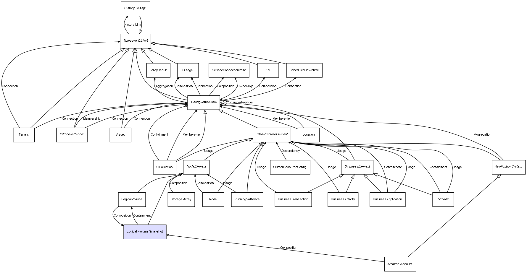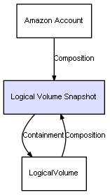 | Amazon Account | Logical Volume Snapshot | Composition | Represents a relation between 2 objects where one is contained within the other, and the included object can not exist without its container. Therefore, when the container is deleted, all its contained object will be automatically removed |