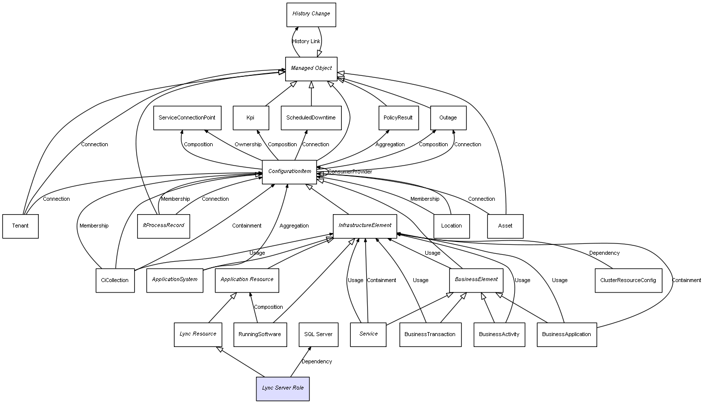 | Lync Server Role | SQL Server | Dependency | represents a dependency between 2 objects |