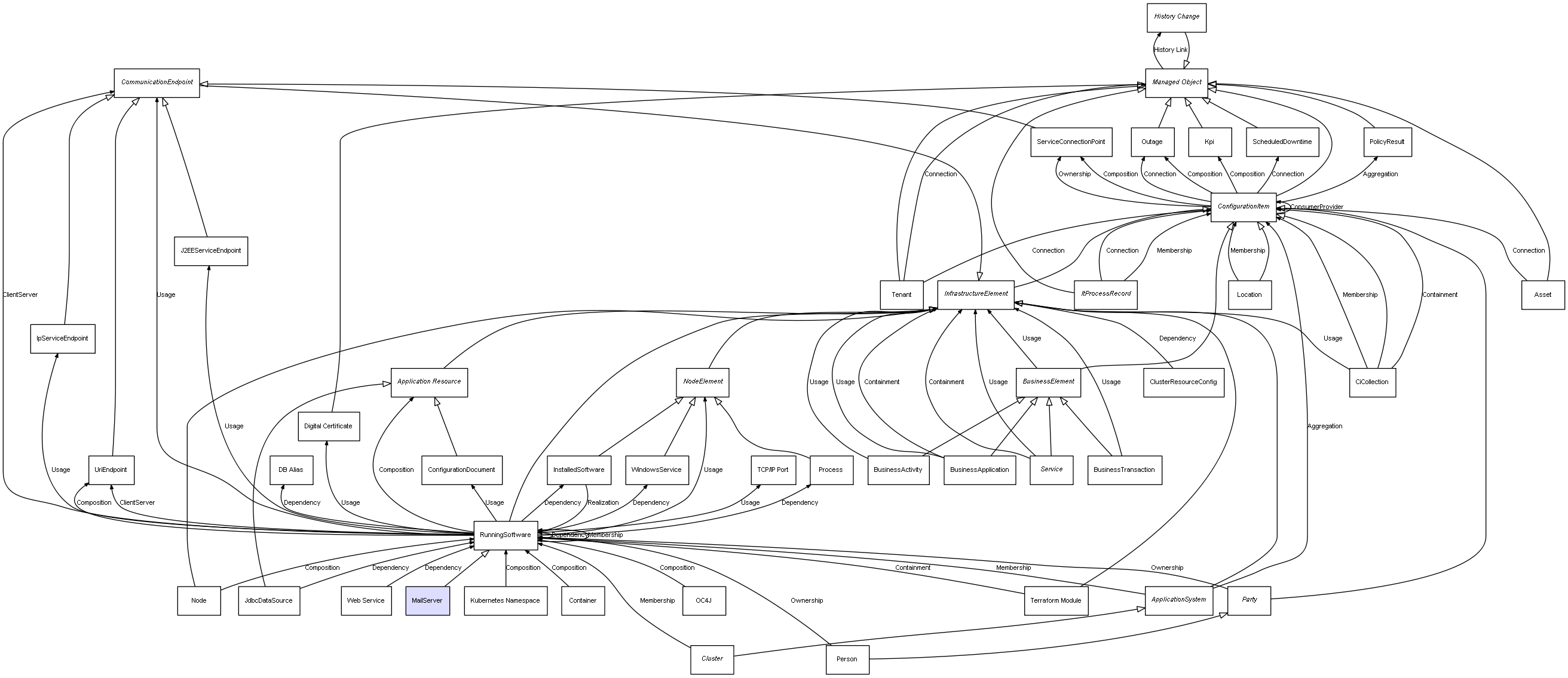| ConfigurationItem | ServiceConnectionPoint | Composition | Represents a relation between 2 objects where one is contained within the other, and the included object can not exist without its container. Therefore, when the container is deleted, all its contained object will be automatically removed |