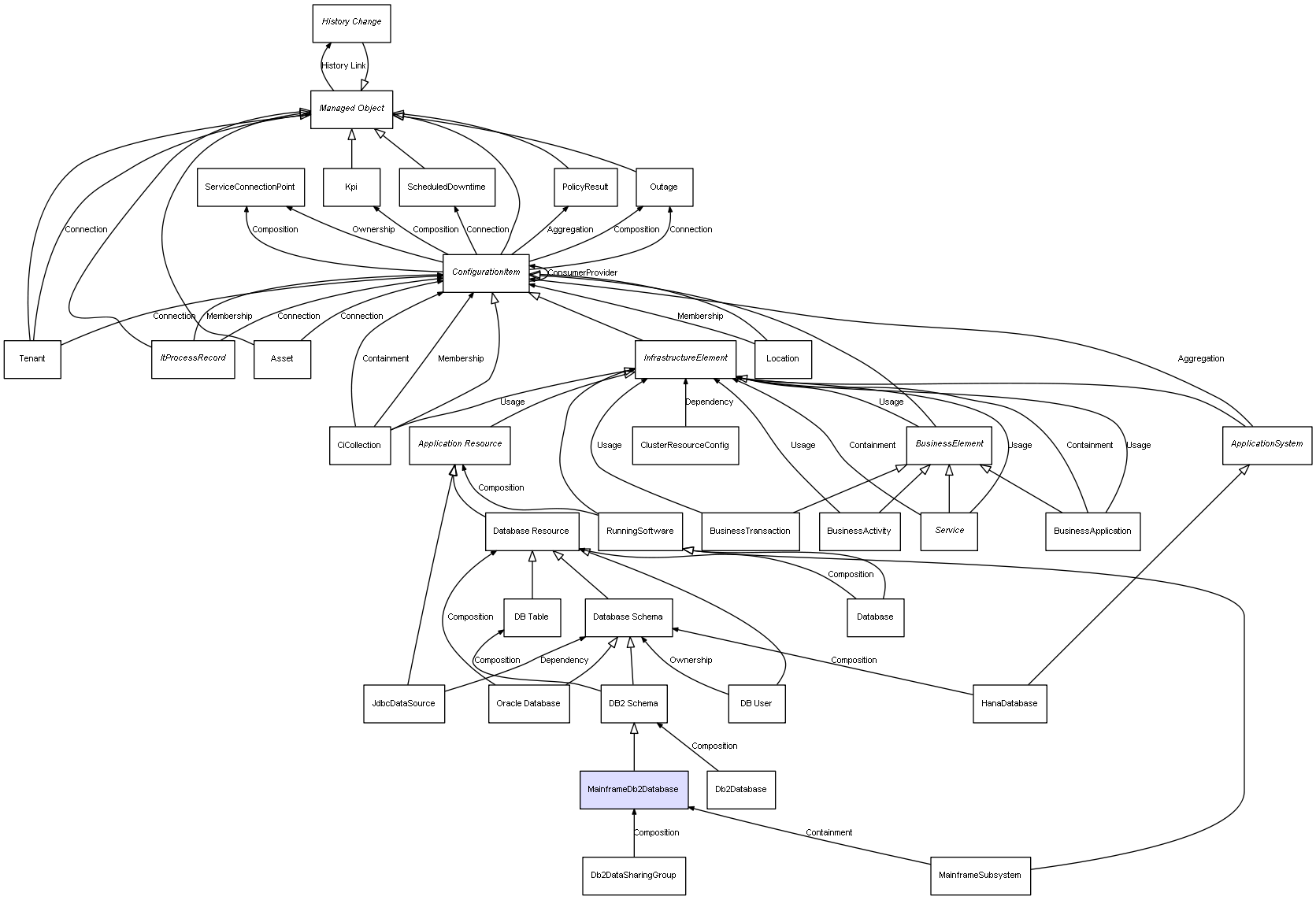 | Db2DataSharingGroup | MainframeDb2Database | Composition | Represents a relation between 2 objects where one is contained within the other, and the included object can not exist without its container. Therefore, when the container is deleted, all its contained object will be automatically removed |