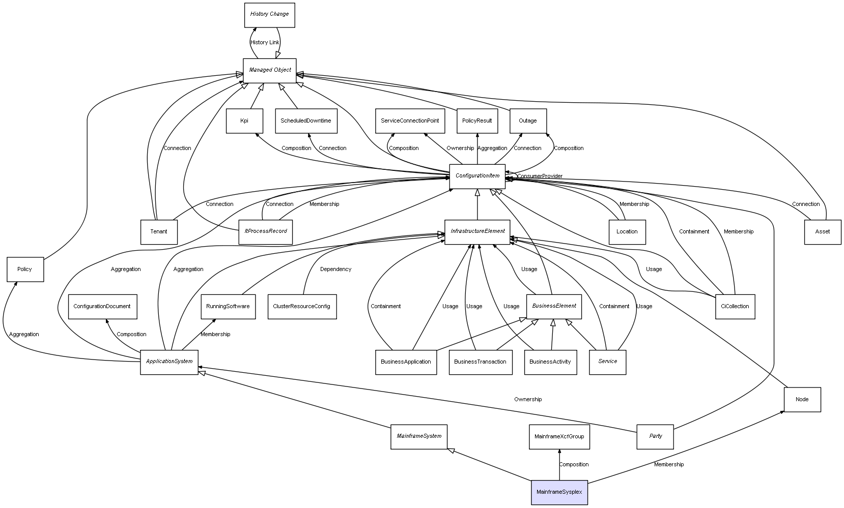 | MainframeSysplex | MainframeXcfGroup | Composition | Represents a relation between 2 objects where one is contained within the other, and the included object can not exist without its container. Therefore, when the container is deleted, all its contained object will be automatically removed |