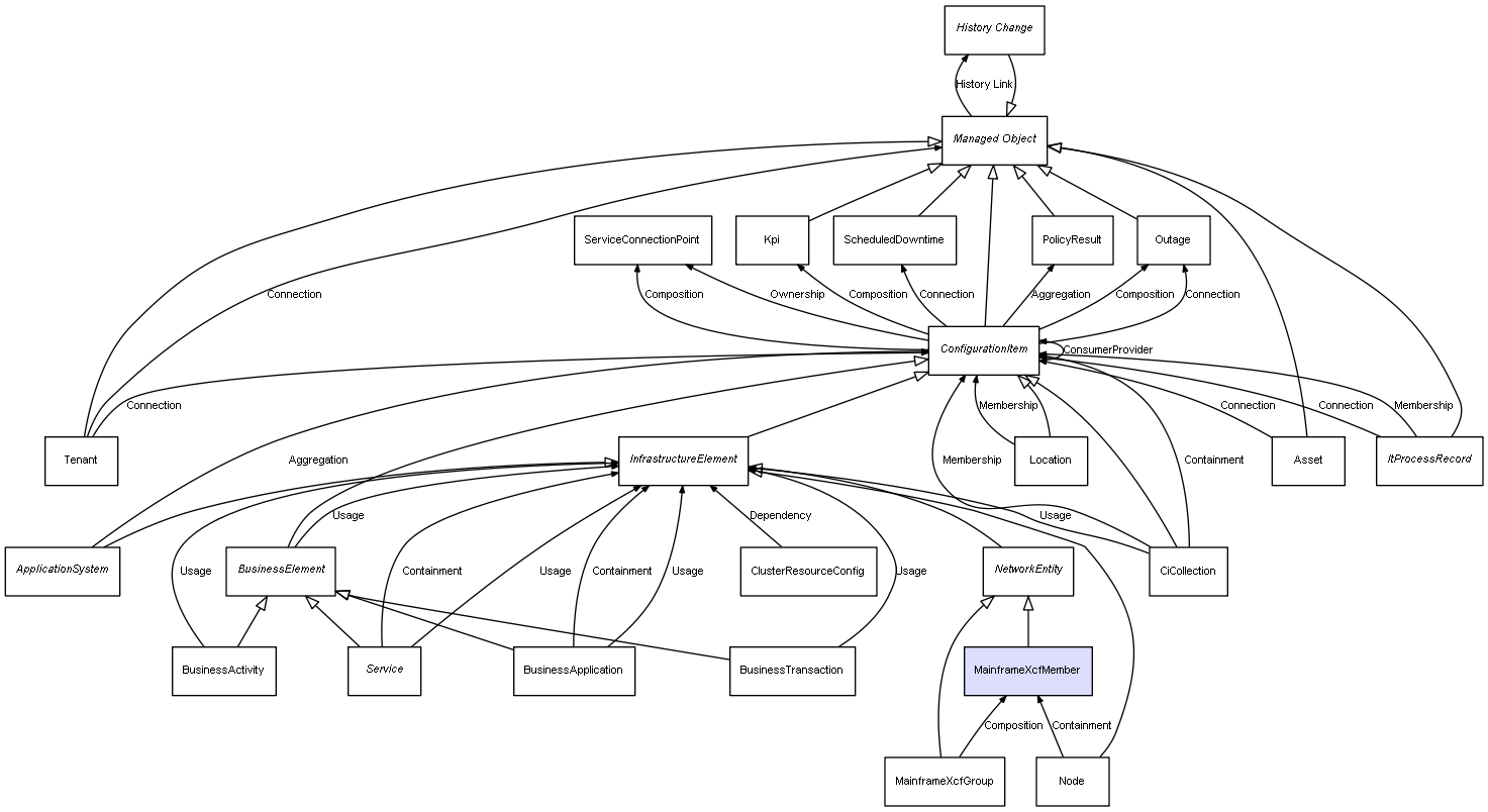 | MainframeXcfGroup | MainframeXcfMember | Composition | Represents a relation between 2 objects where one is contained within the other, and the included object can not exist without its container. Therefore, when the container is deleted, all its contained object will be automatically removed |