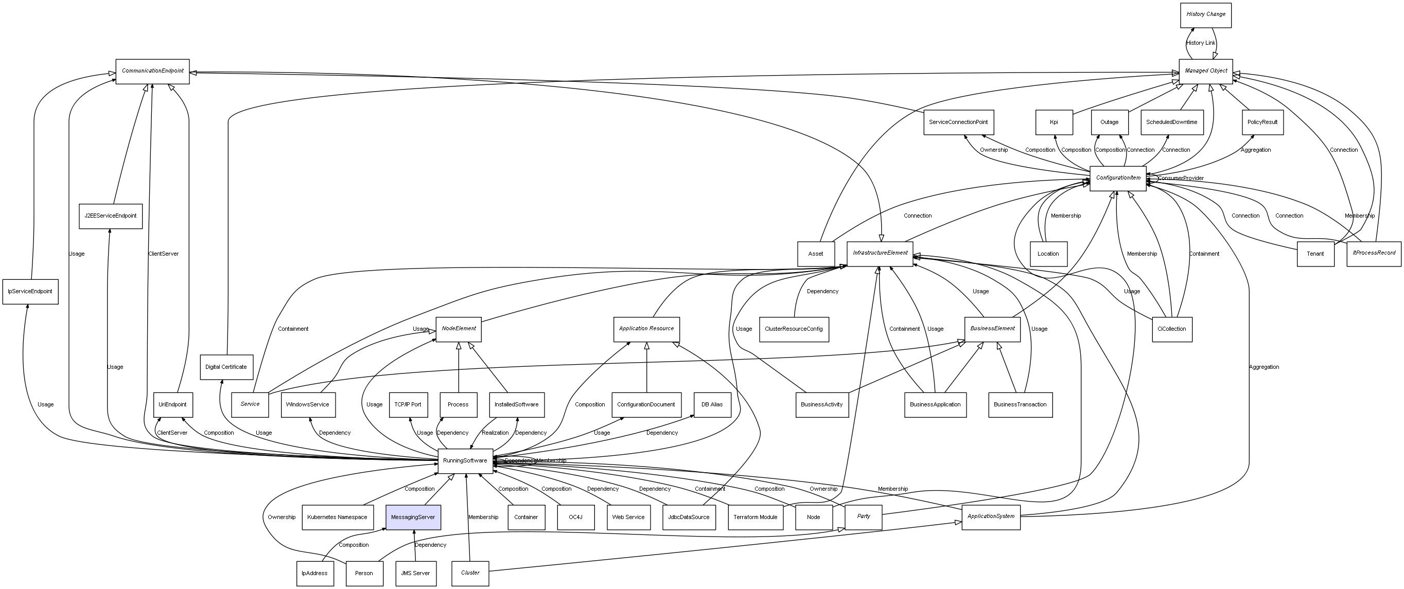 | ConfigurationItem | ServiceConnectionPoint | Composition | Represents a relation between 2 objects where one is contained within the other, and the included object can not exist without its container. Therefore, when the container is deleted, all its contained object will be automatically removed |
