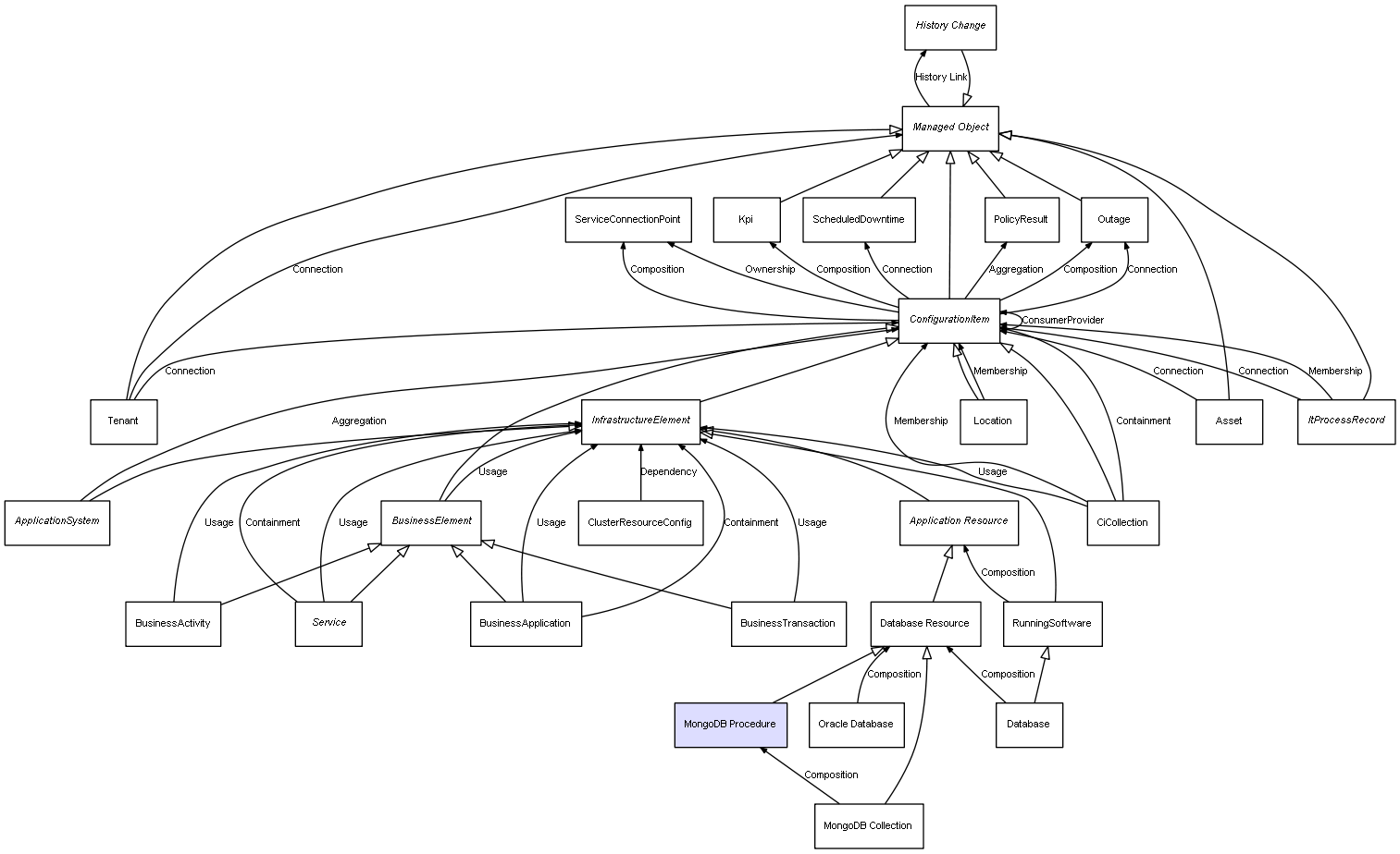 | ConfigurationItem | ServiceConnectionPoint | Composition | Represents a relation between 2 objects where one is contained within the other, and the included object can not exist without its container. Therefore, when the container is deleted, all its contained object will be automatically removed |