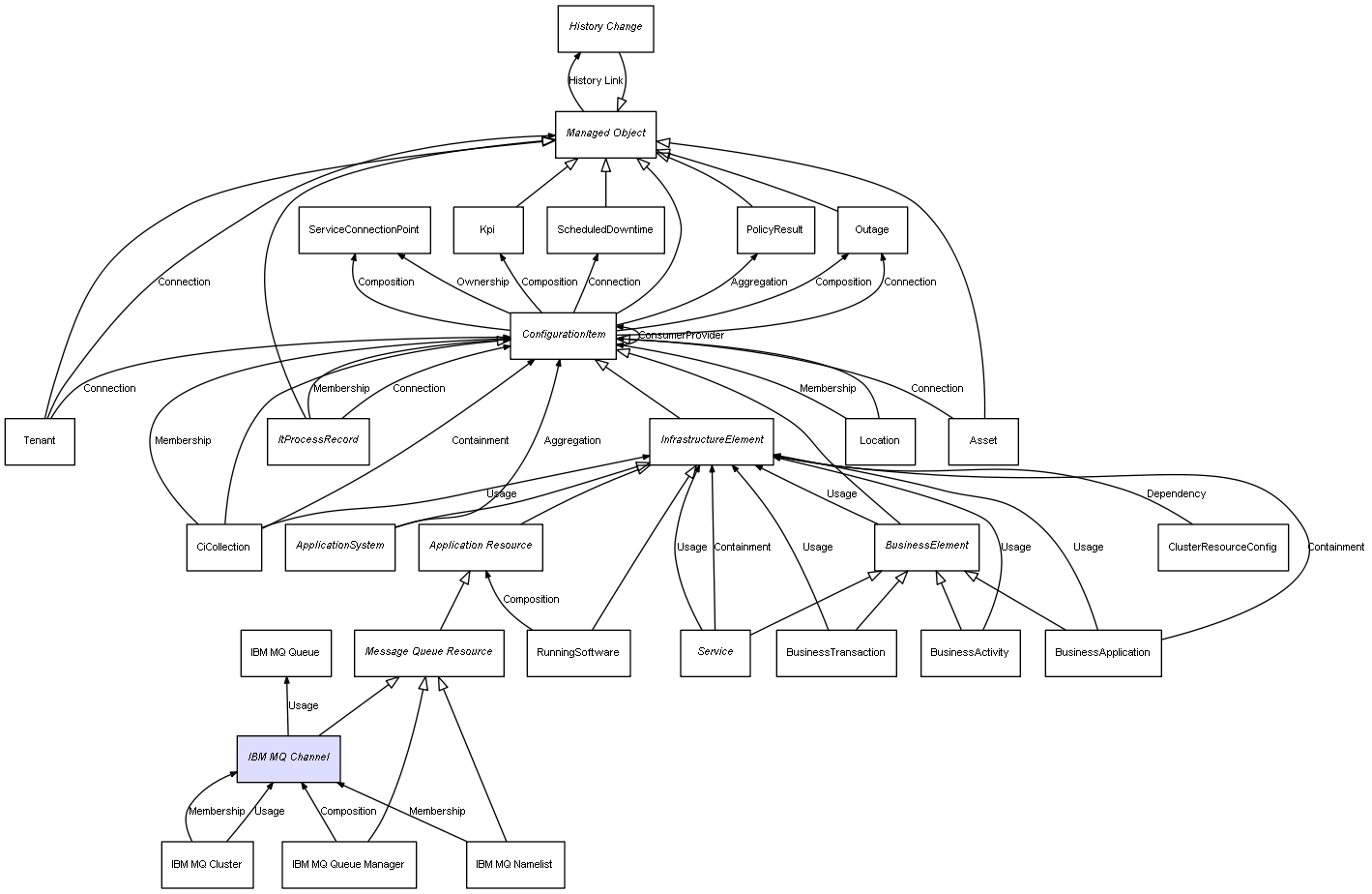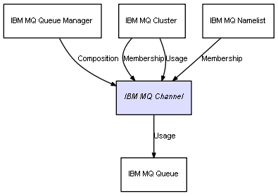 | IBM MQ Queue Manager | IBM MQ Channel | Composition | Represents a relation between 2 objects where one is contained within the other, and the included object can not exist without its container. Therefore, when the container is deleted, all its contained object will be automatically removed |