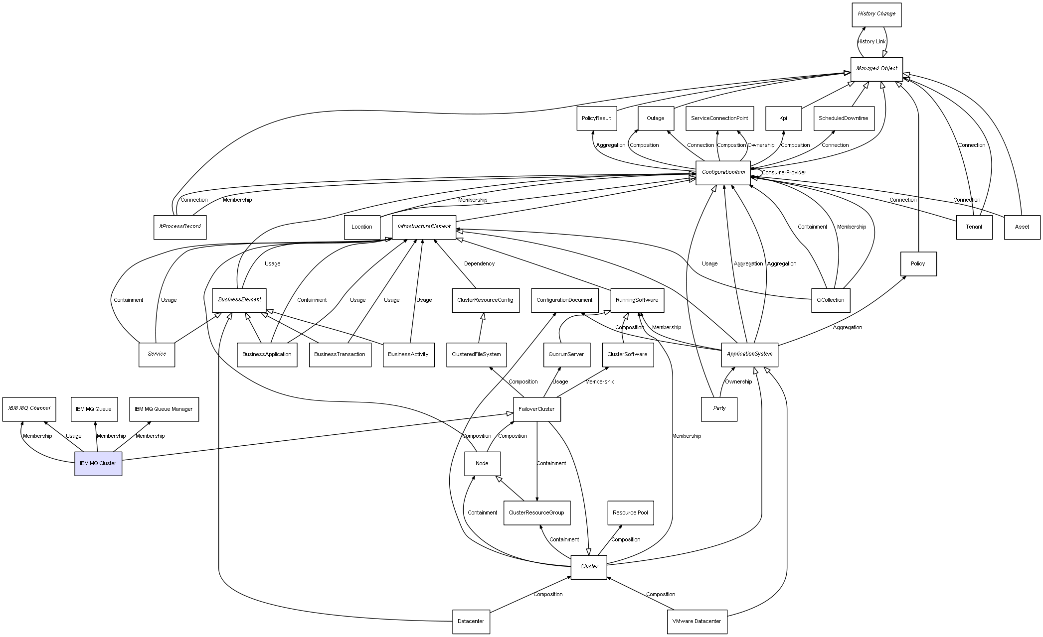 | Cluster | ConfigurationDocument | Composition | Represents a relation between 2 objects where one is contained within the other, and the included object can not exist without its container. Therefore, when the container is deleted, all its contained object will be automatically removed |