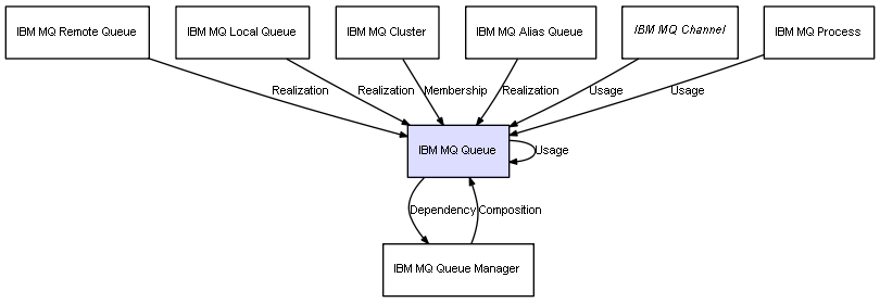 | IBM MQ Queue | IBM MQ Queue Manager | Dependency | represents a dependency between 2 objects |