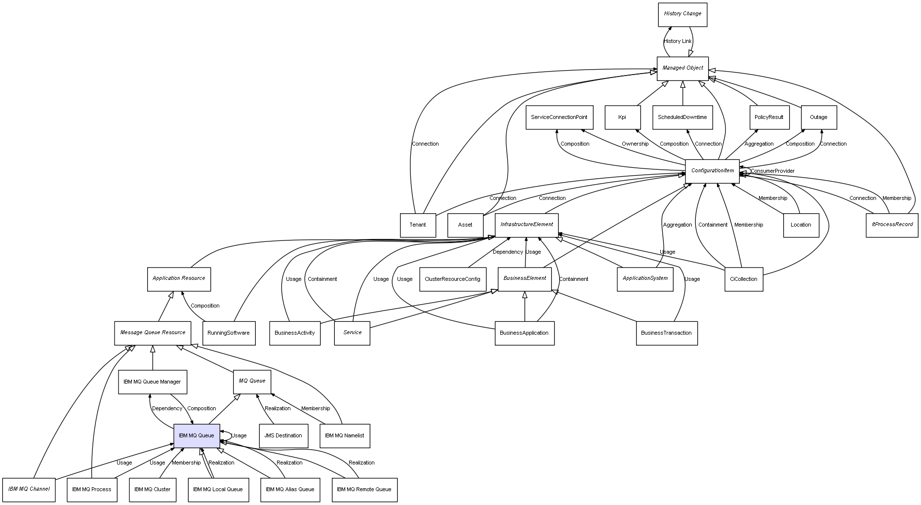 | IBM MQ Queue Manager | IBM MQ Queue | Composition | Represents a relation between 2 objects where one is contained within the other, and the included object can not exist without its container. Therefore, when the container is deleted, all its contained object will be automatically removed |