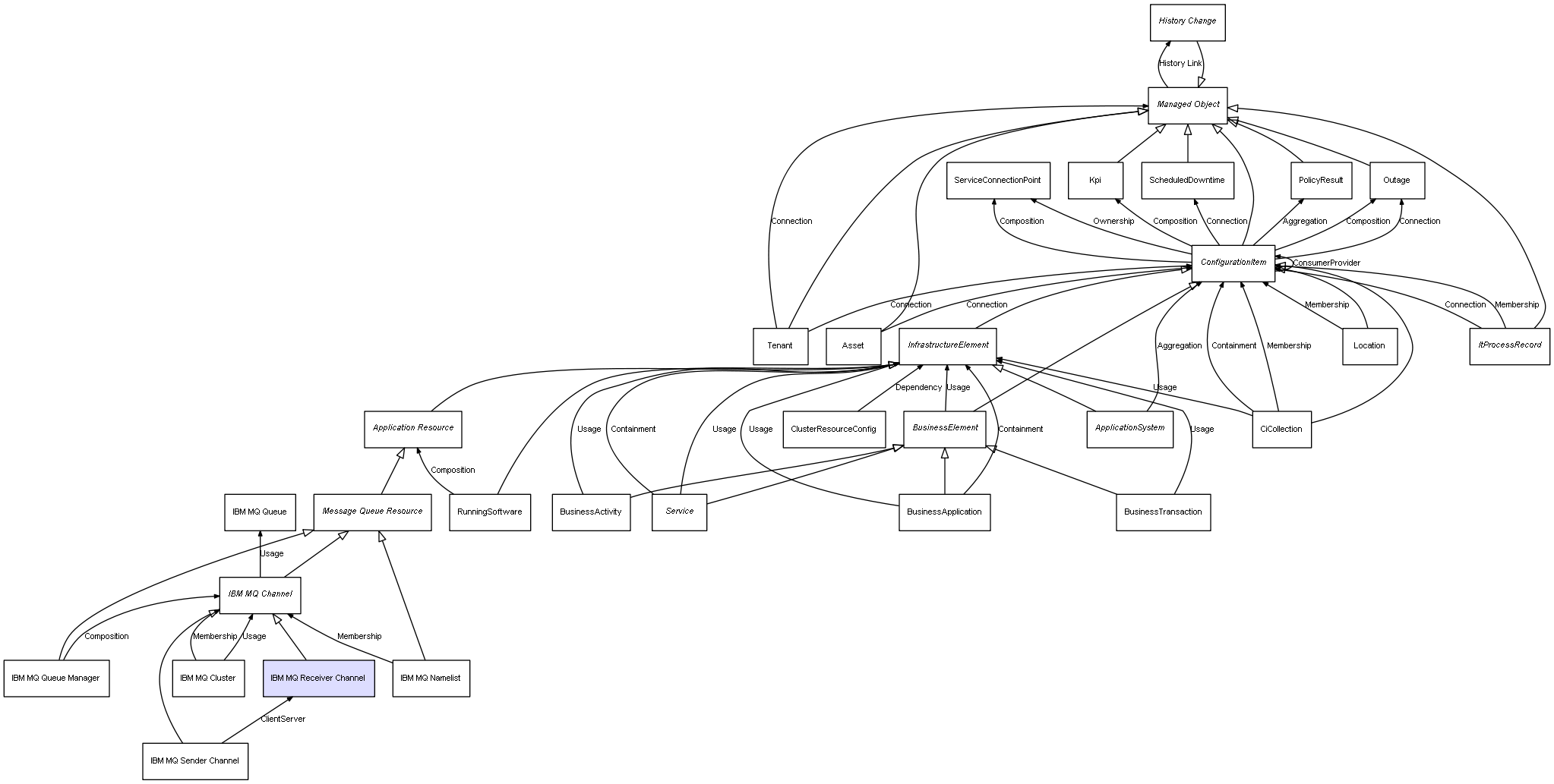 | IBM MQ Queue Manager | IBM MQ Channel | Composition | Represents a relation between 2 objects where one is contained within the other, and the included object can not exist without its container. Therefore, when the container is deleted, all its contained object will be automatically removed |