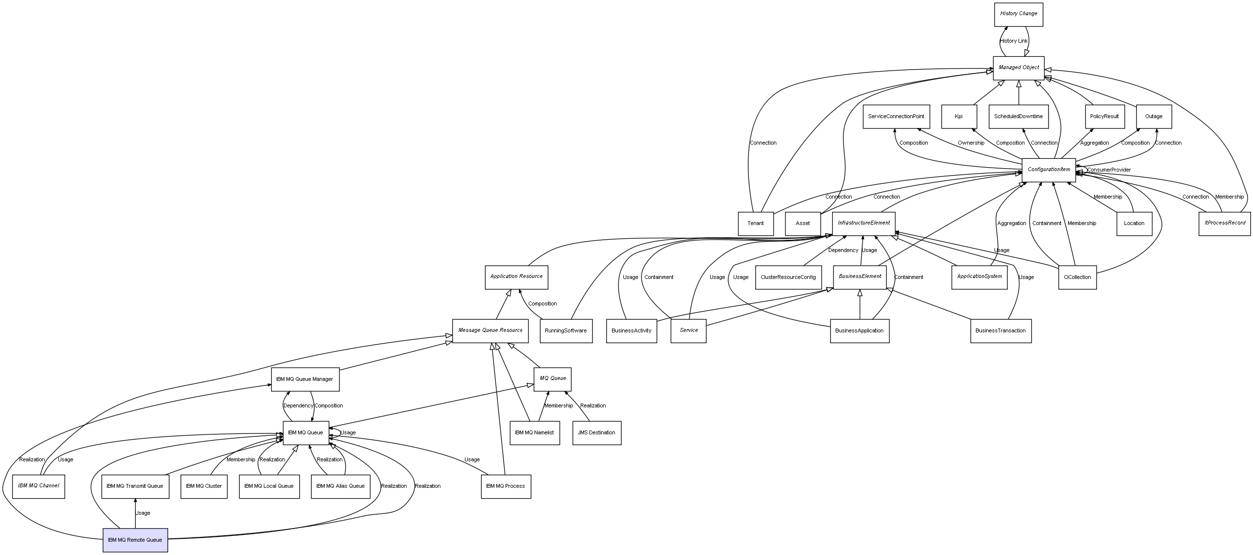 | IBM MQ Queue Manager | IBM MQ Queue | Composition | Represents a relation between 2 objects where one is contained within the other, and the included object can not exist without its container. Therefore, when the container is deleted, all its contained object will be automatically removed |