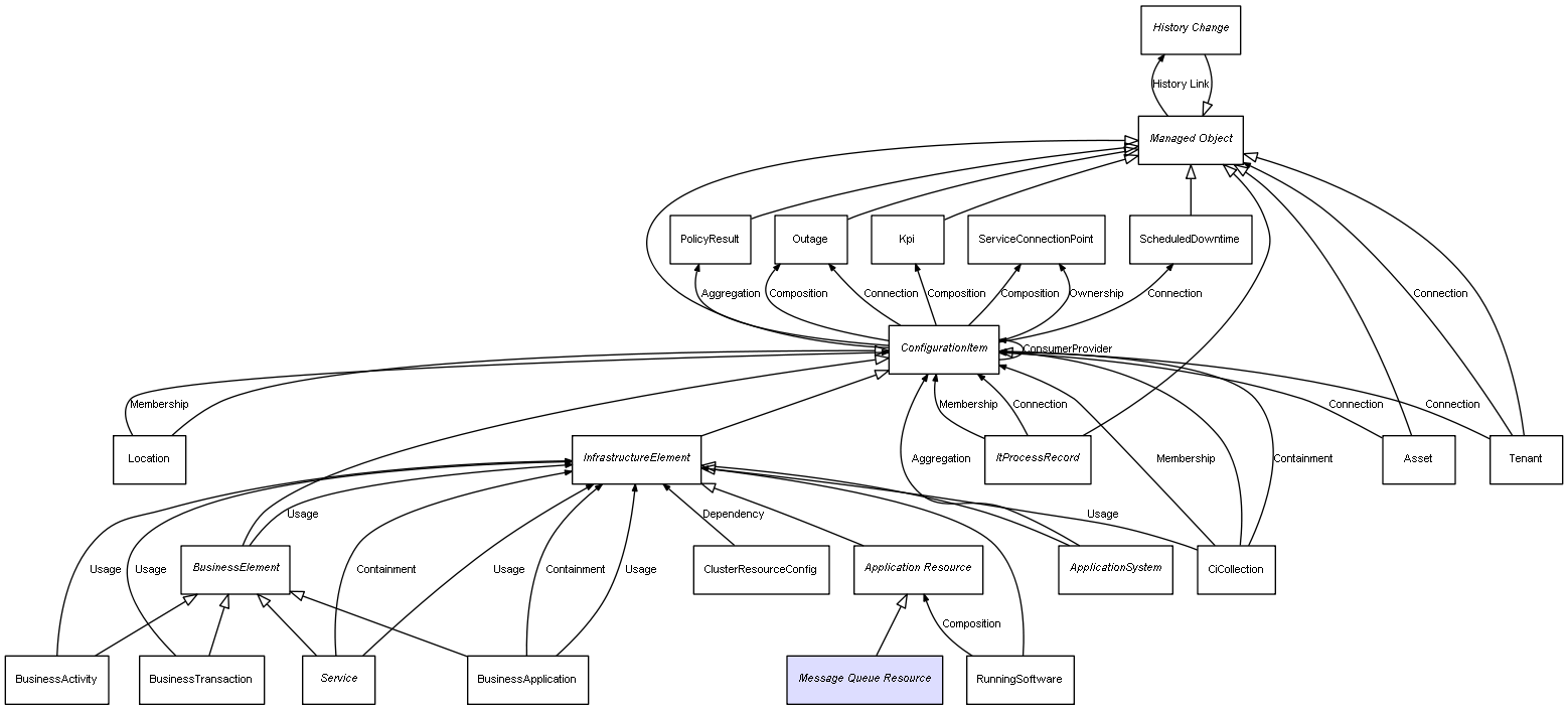 | ConfigurationItem | ServiceConnectionPoint | Composition | Represents a relation between 2 objects where one is contained within the other, and the included object can not exist without its container. Therefore, when the container is deleted, all its contained object will be automatically removed |