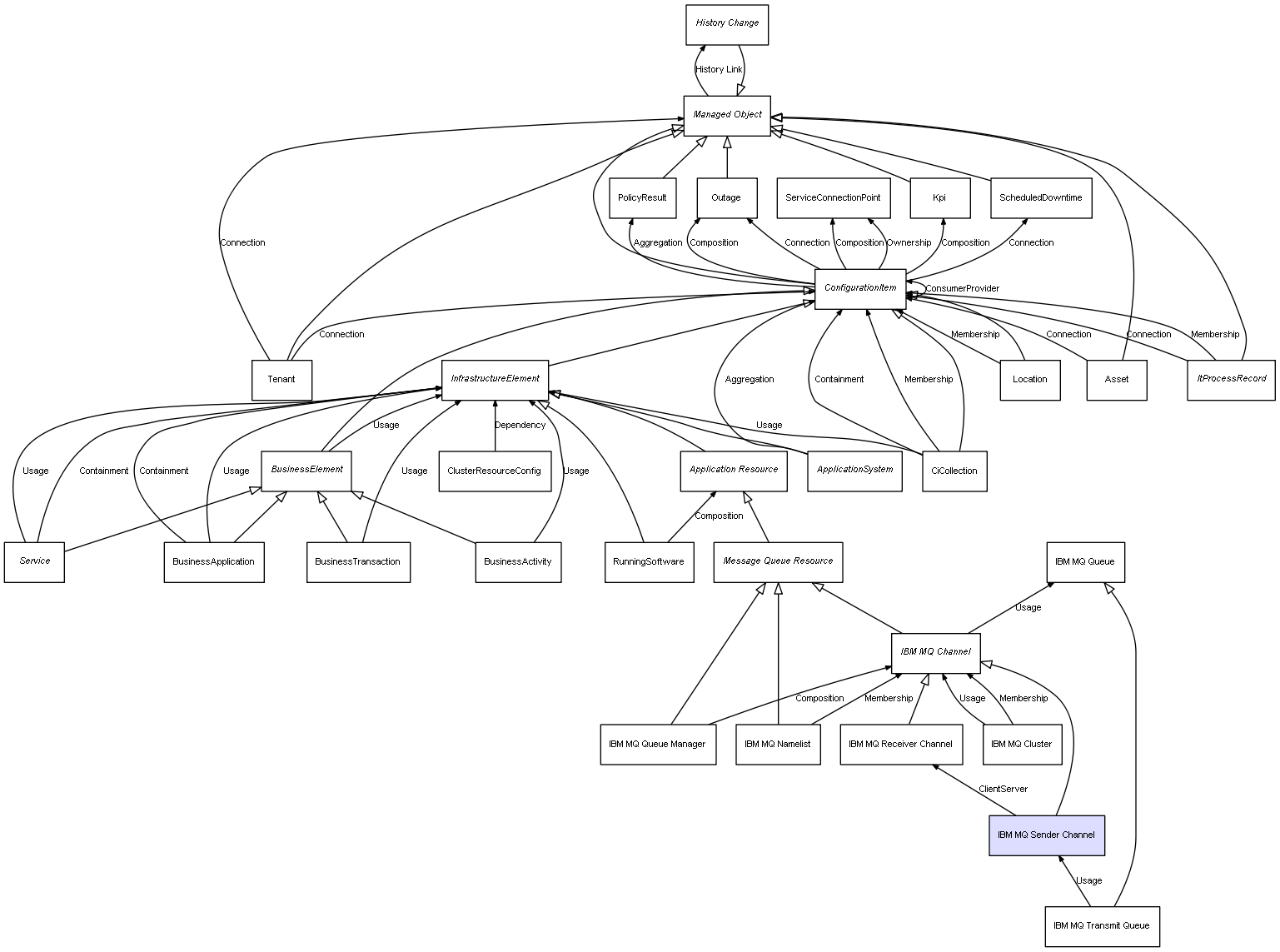 | IBM MQ Queue Manager | IBM MQ Channel | Composition | Represents a relation between 2 objects where one is contained within the other, and the included object can not exist without its container. Therefore, when the container is deleted, all its contained object will be automatically removed |