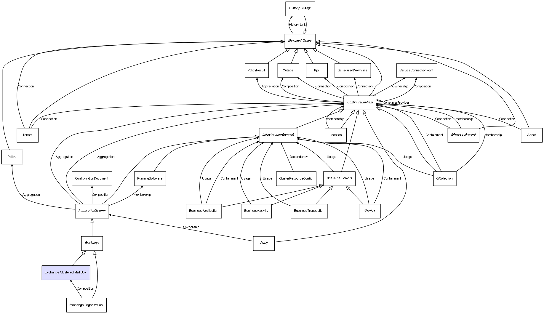 | Exchange Organization | Exchange Clustered Mail Box | Composition | Represents a relation between 2 objects where one is contained within the other, and the included object can not exist without its container. Therefore, when the container is deleted, all its contained object will be automatically removed |