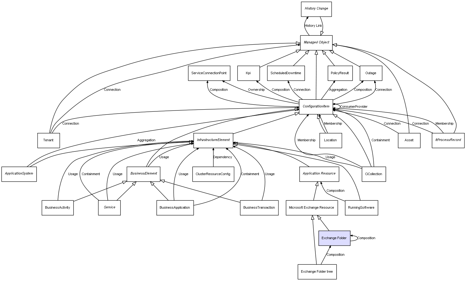 | Exchange Folder | Exchange Folder | Composition | Represents a relation between 2 objects where one is contained within the other, and the included object can not exist without its container. Therefore, when the container is deleted, all its contained object will be automatically removed |