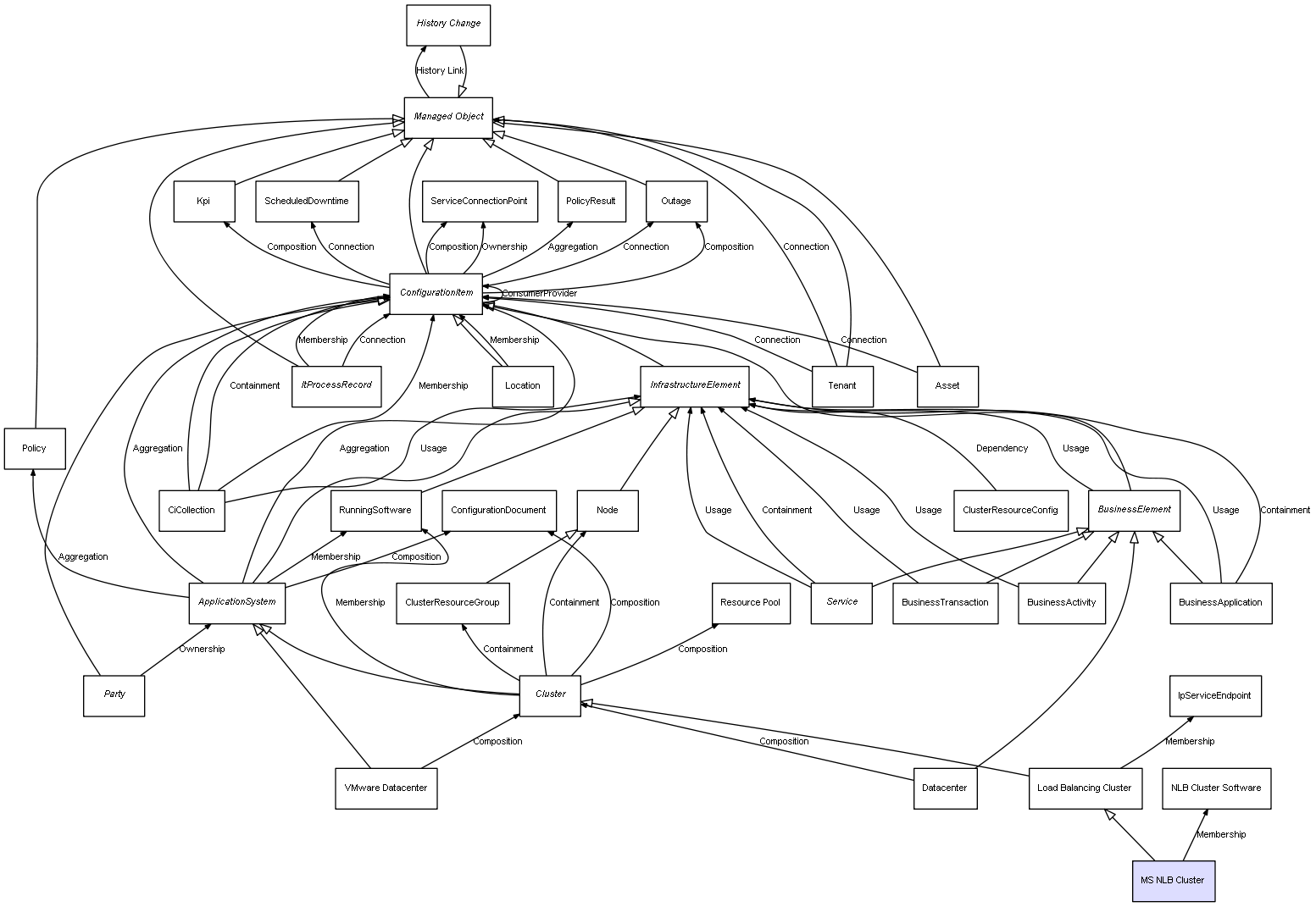 | Cluster | ConfigurationDocument | Composition | Represents a relation between 2 objects where one is contained within the other, and the included object can not exist without its container. Therefore, when the container is deleted, all its contained object will be automatically removed |