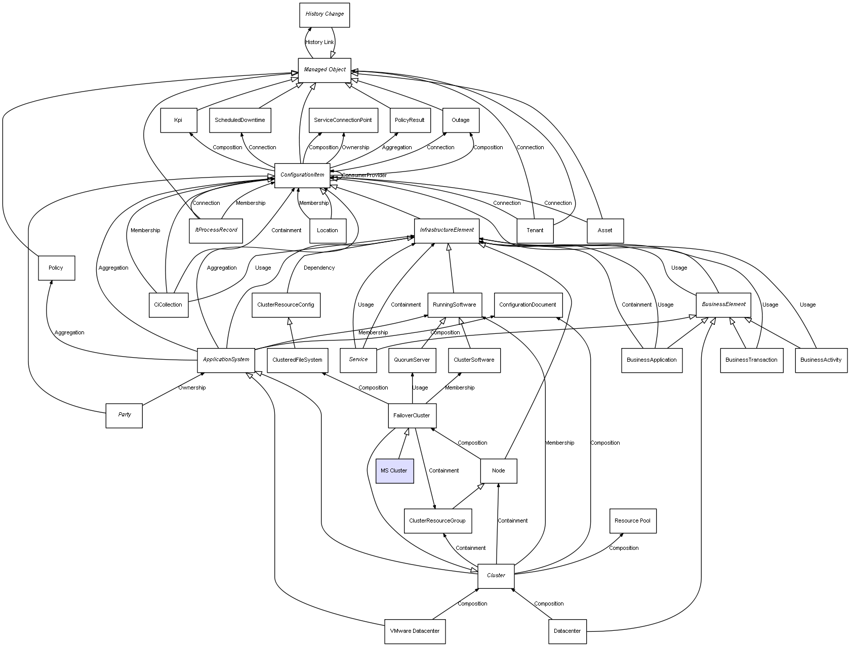 Combined inheritance and relation diagram for MS Cluster