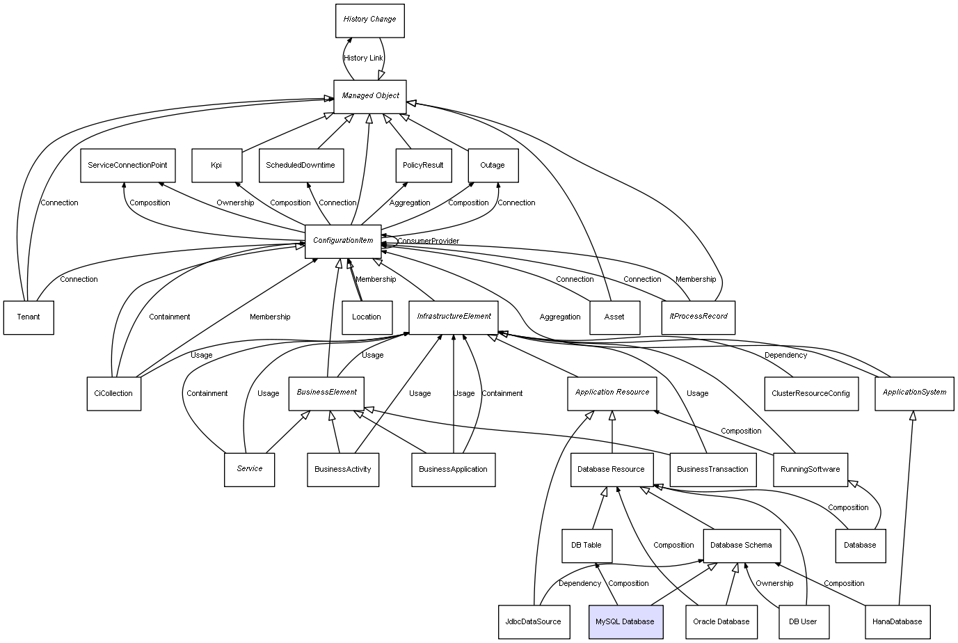 | ConfigurationItem | ServiceConnectionPoint | Composition | Represents a relation between 2 objects where one is contained within the other, and the included object can not exist without its container. Therefore, when the container is deleted, all its contained object will be automatically removed |