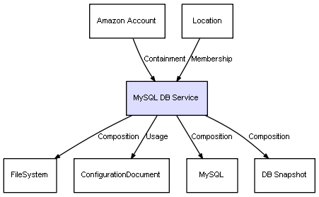 | DB Service | Amazon RDS Config | Composition | Represents a relation between 2 objects where one is contained within the other, and the included object can not exist without its container. Therefore, when the container is deleted, all its contained object will be automatically removed |