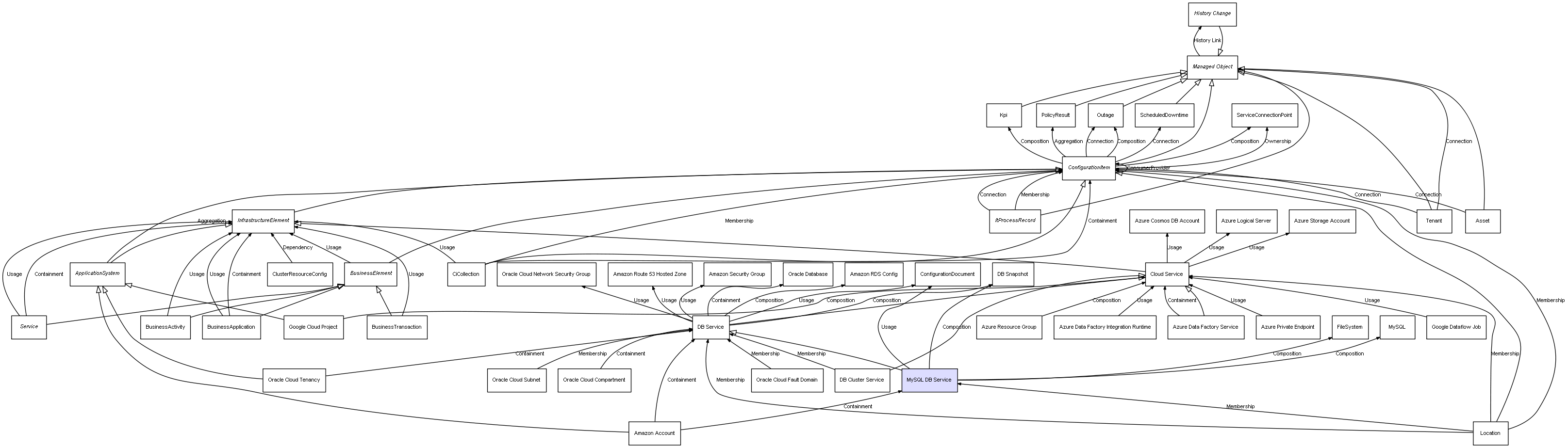 | DB Service | DB Snapshot | Composition | Represents a relation between 2 objects where one is contained within the other, and the included object can not exist without its container. Therefore, when the container is deleted, all its contained object will be automatically removed |