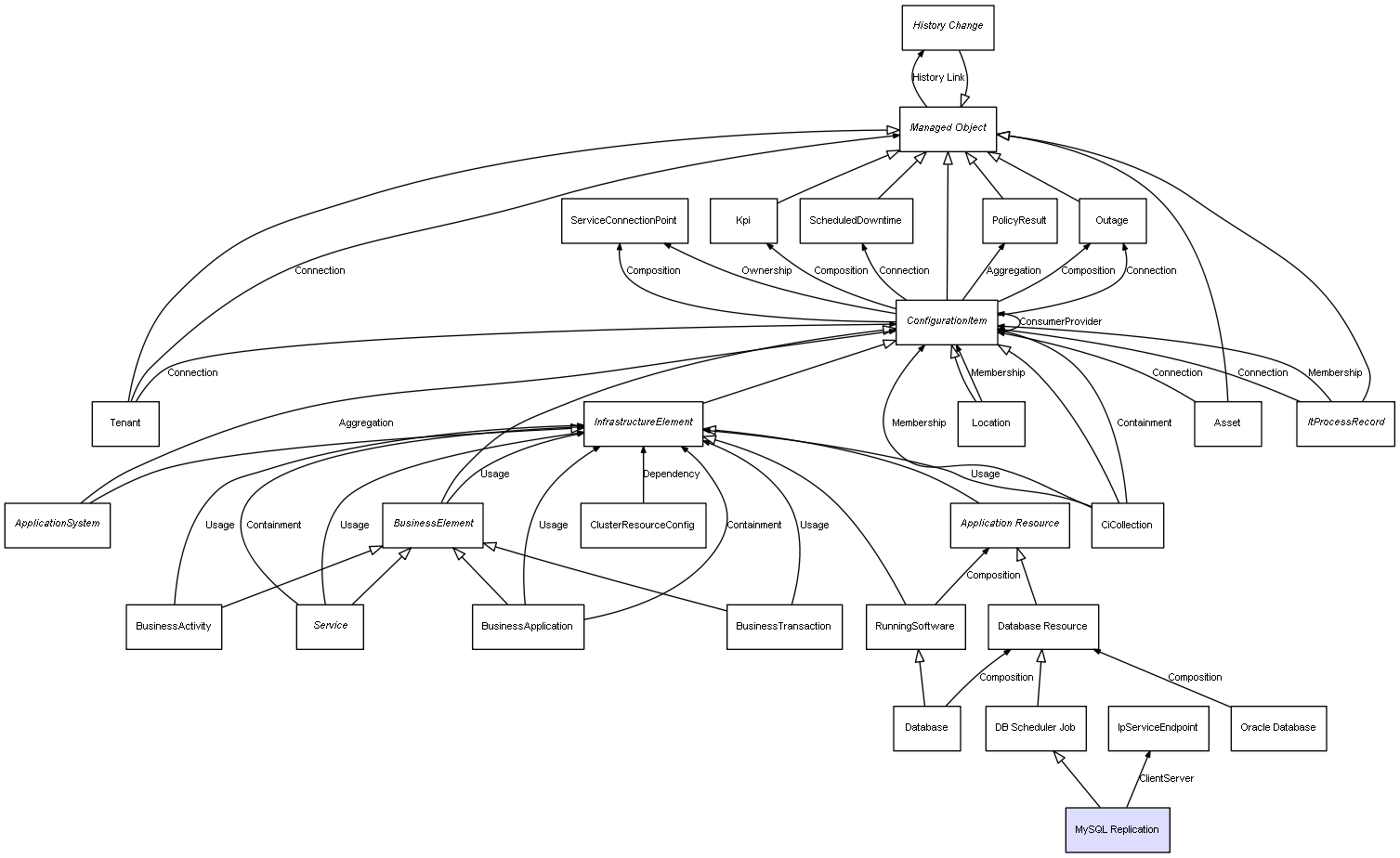 | ConfigurationItem | ServiceConnectionPoint | Composition | Represents a relation between 2 objects where one is contained within the other, and the included object can not exist without its container. Therefore, when the container is deleted, all its contained object will be automatically removed |
