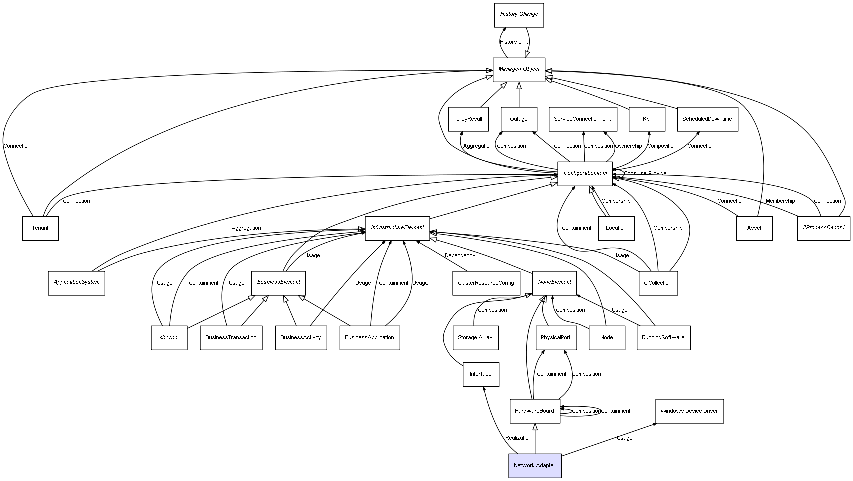 | ConfigurationItem | ServiceConnectionPoint | Composition | Represents a relation between 2 objects where one is contained within the other, and the included object can not exist without its container. Therefore, when the container is deleted, all its contained object will be automatically removed |