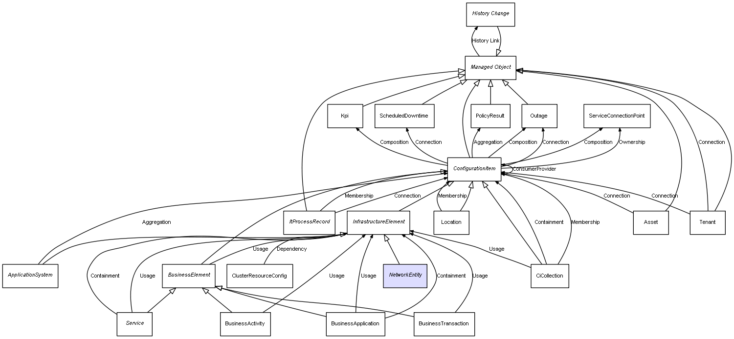 | ConfigurationItem | Outage | Composition | Represents a relation between 2 objects where one is contained within the other, and the included object can not exist without its container. Therefore, when the container is deleted, all its contained object will be automatically removed |