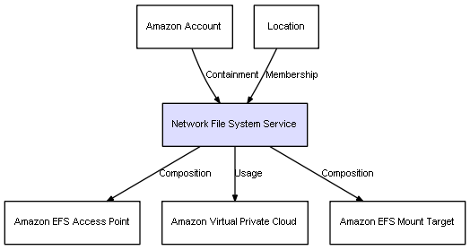 | Network File System Service | Amazon EFS Access Point | Composition | Represents a relation between 2 objects where one is contained within the other, and the included object can not exist without its container. Therefore, when the container is deleted, all its contained object will be automatically removed |