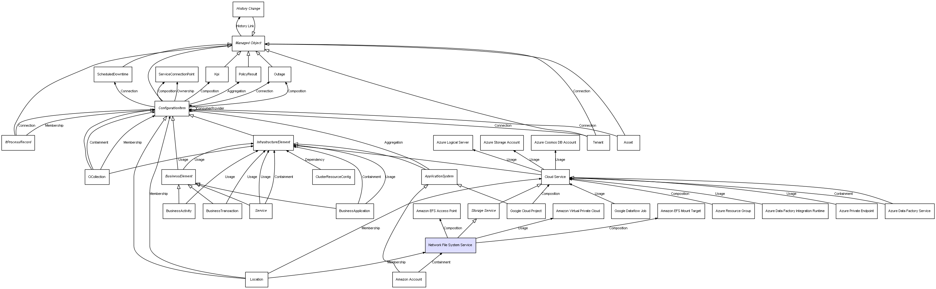 | ConfigurationItem | ServiceConnectionPoint | Composition | Represents a relation between 2 objects where one is contained within the other, and the included object can not exist without its container. Therefore, when the container is deleted, all its contained object will be automatically removed |