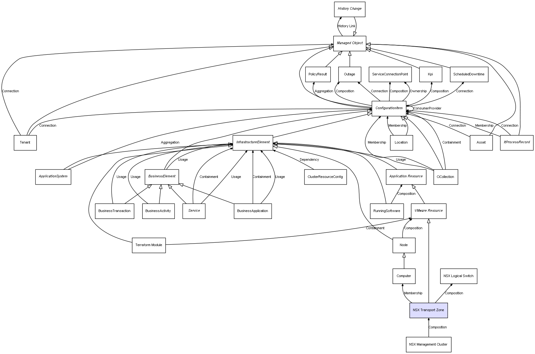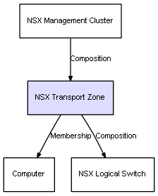 | NSX Management Cluster | NSX Transport Zone | Composition | Represents a relation between 2 objects where one is contained within the other, and the included object can not exist without its container. Therefore, when the container is deleted, all its contained object will be automatically removed |