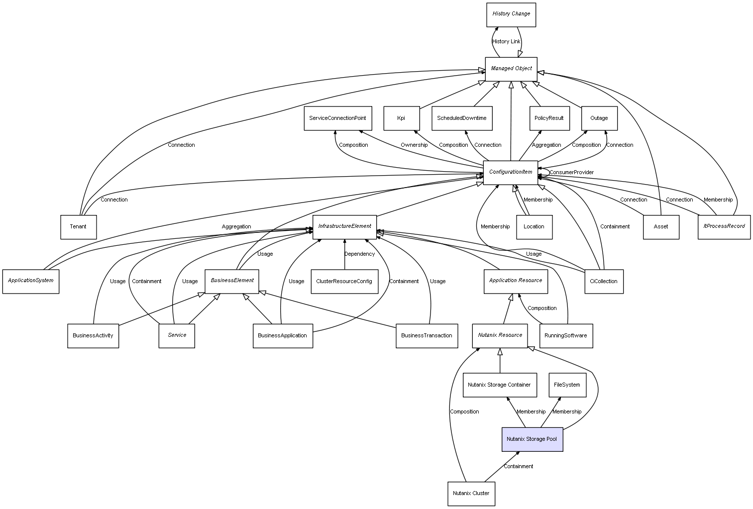 | Nutanix Cluster | Nutanix Resource | Composition | Represents a relation between 2 objects where one is contained within the other, and the included object can not exist without its container. Therefore, when the container is deleted, all its contained object will be automatically removed |