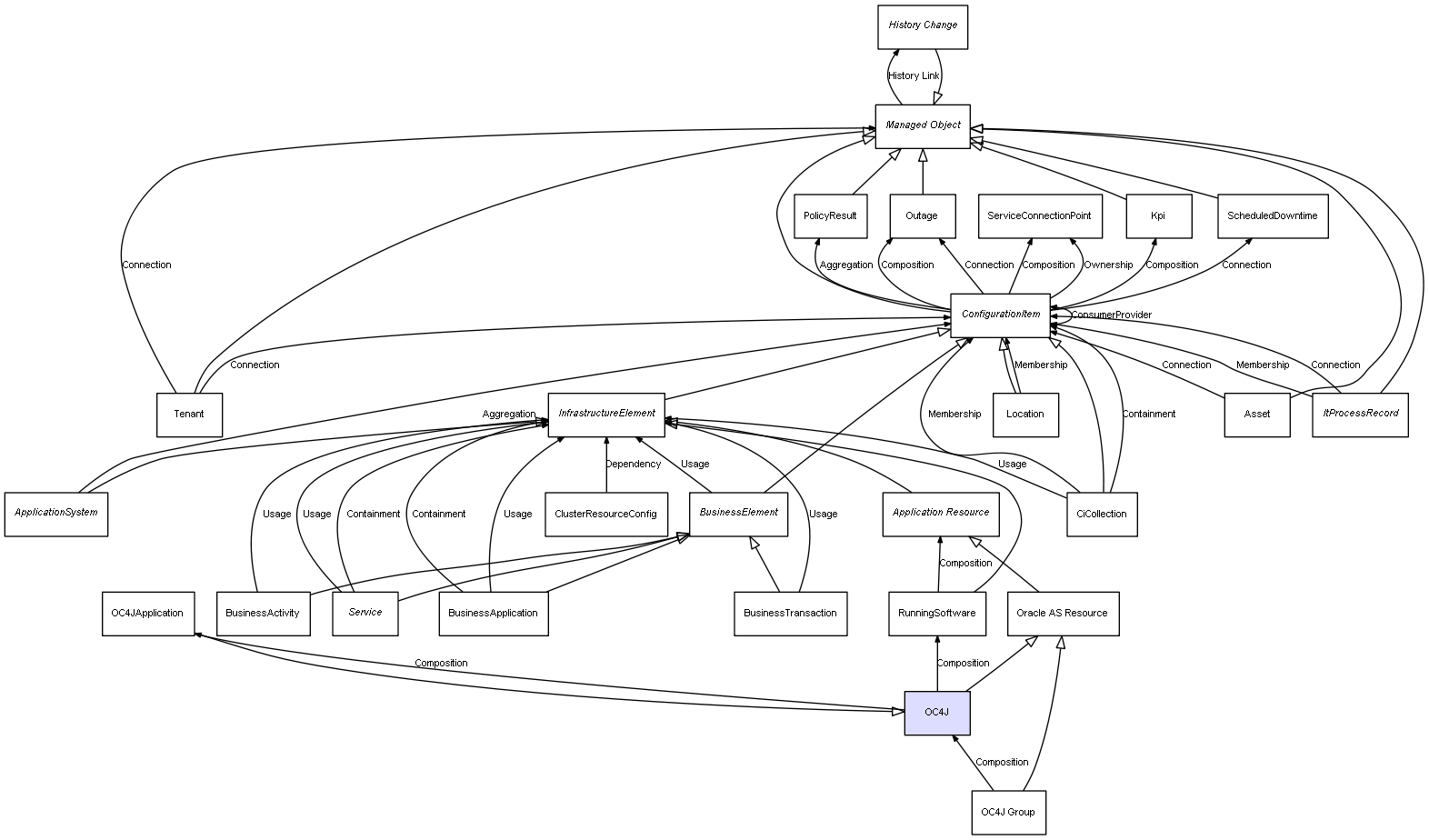 | OC4J | OC4JApplication | Composition | Represents a relation between 2 objects where one is contained within the other, and the included object can not exist without its container. Therefore, when the container is deleted, all its contained object will be automatically removed |
