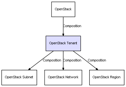 | OpenStack | OpenStack Tenant | Composition | Represents a relation between 2 objects where one is contained within the other, and the included object can not exist without its container. Therefore, when the container is deleted, all its contained object will be automatically removed |