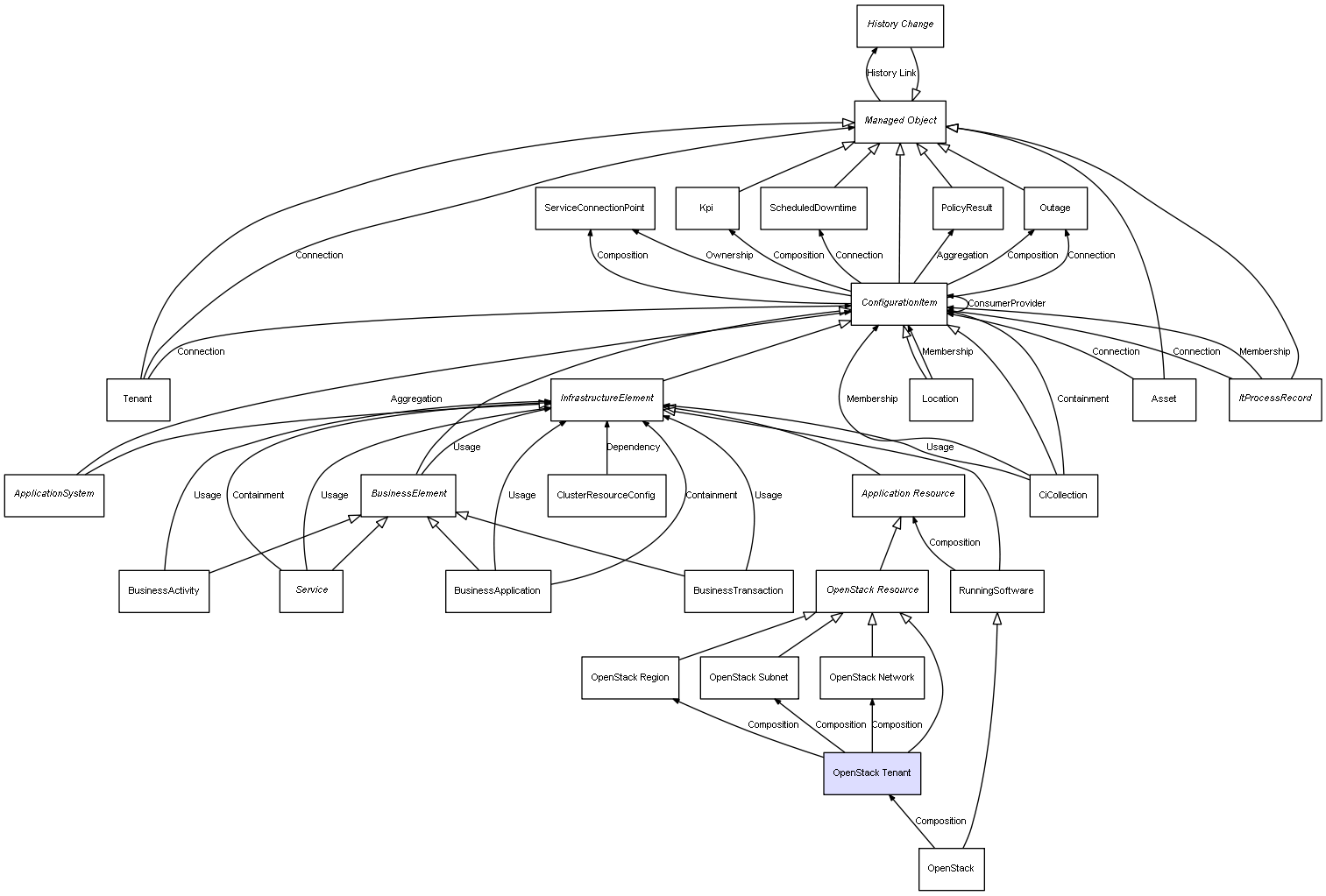 | OpenStack Tenant | OpenStack Subnet | Composition | Represents a relation between 2 objects where one is contained within the other, and the included object can not exist without its container. Therefore, when the container is deleted, all its contained object will be automatically removed |