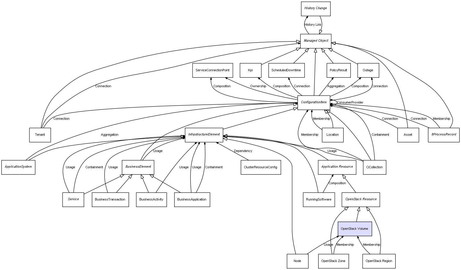 | ConfigurationItem | Outage | Composition | Represents a relation between 2 objects where one is contained within the other, and the included object can not exist without its container. Therefore, when the container is deleted, all its contained object will be automatically removed |
