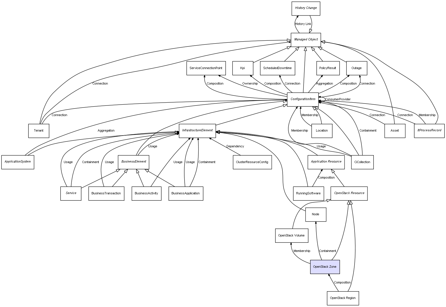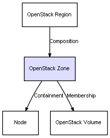 | OpenStack Region | OpenStack Zone | Composition | Represents a relation between 2 objects where one is contained within the other, and the included object can not exist without its container. Therefore, when the container is deleted, all its contained object will be automatically removed |