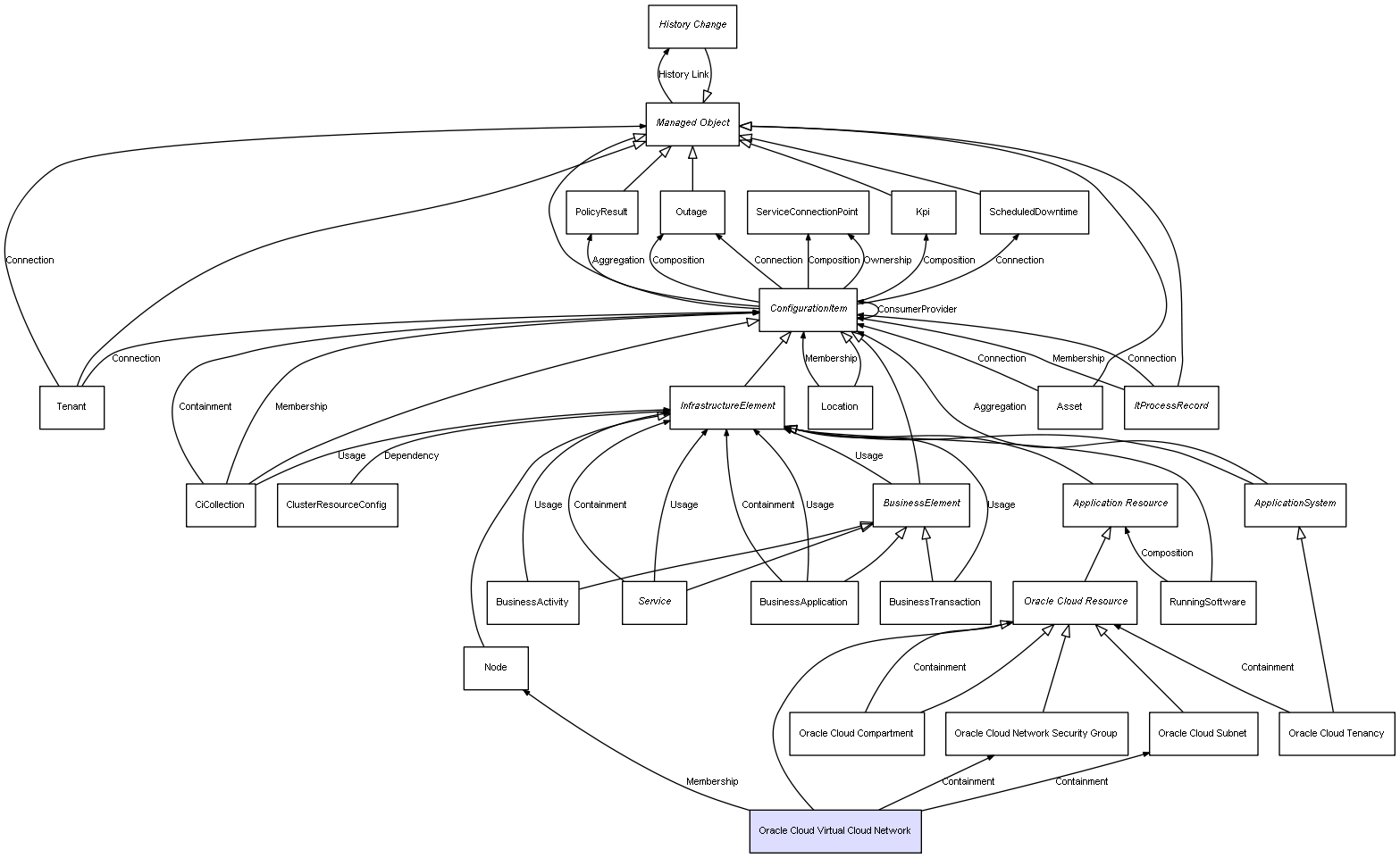 | ConfigurationItem | ServiceConnectionPoint | Composition | Represents a relation between 2 objects where one is contained within the other, and the included object can not exist without its container. Therefore, when the container is deleted, all its contained object will be automatically removed |