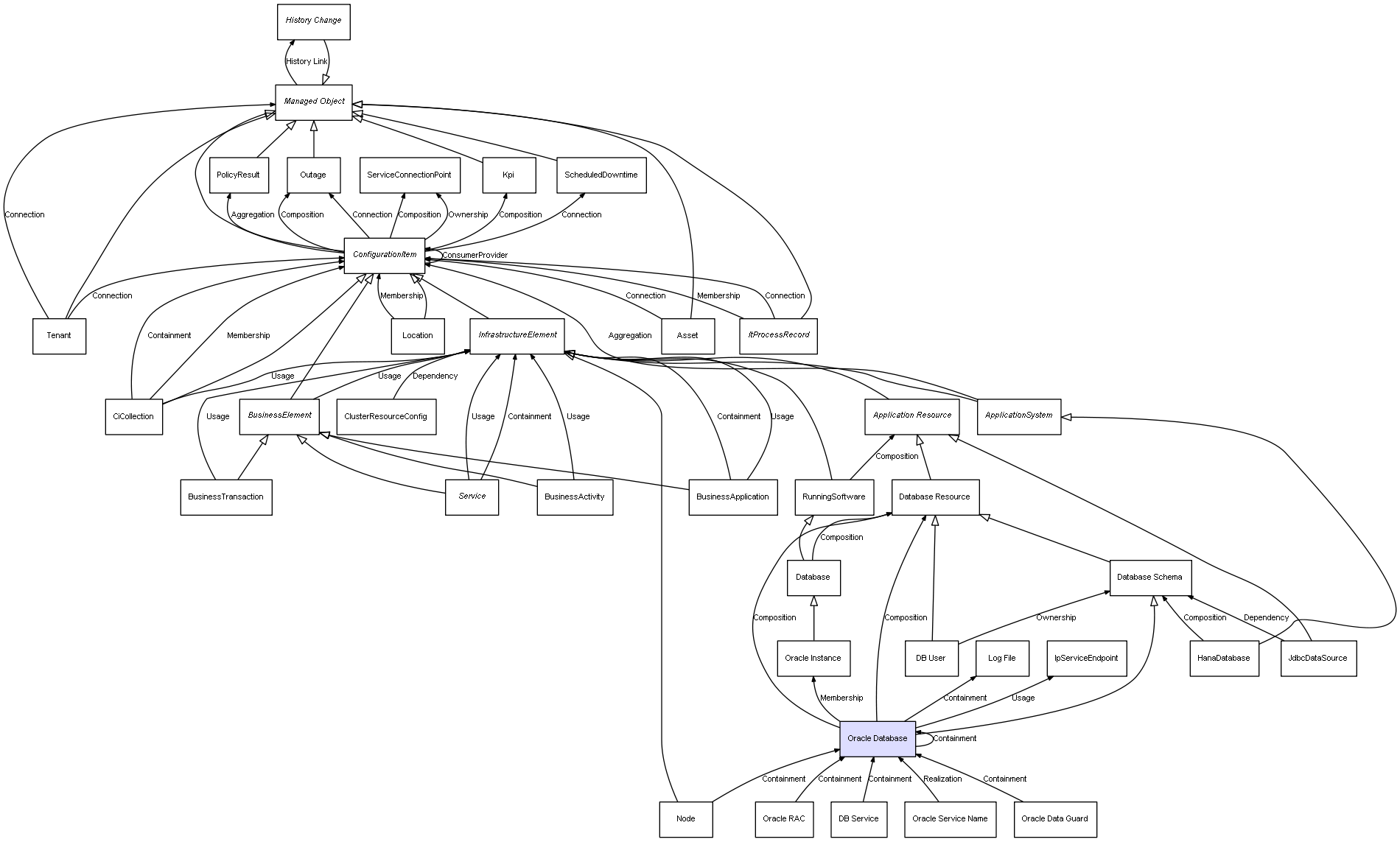 | ConfigurationItem | Outage | Composition | Represents a relation between 2 objects where one is contained within the other, and the included object can not exist without its container. Therefore, when the container is deleted, all its contained object will be automatically removed |
