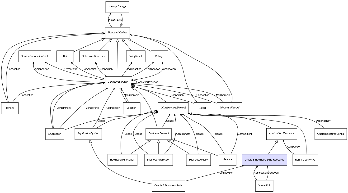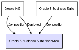| Oracle iAS | Oracle E-Business Suite Resource | Composition | Represents a relation between 2 objects where one is contained within the other, and the included object can not exist without its container. Therefore, when the container is deleted, all its contained object will be automatically removed |