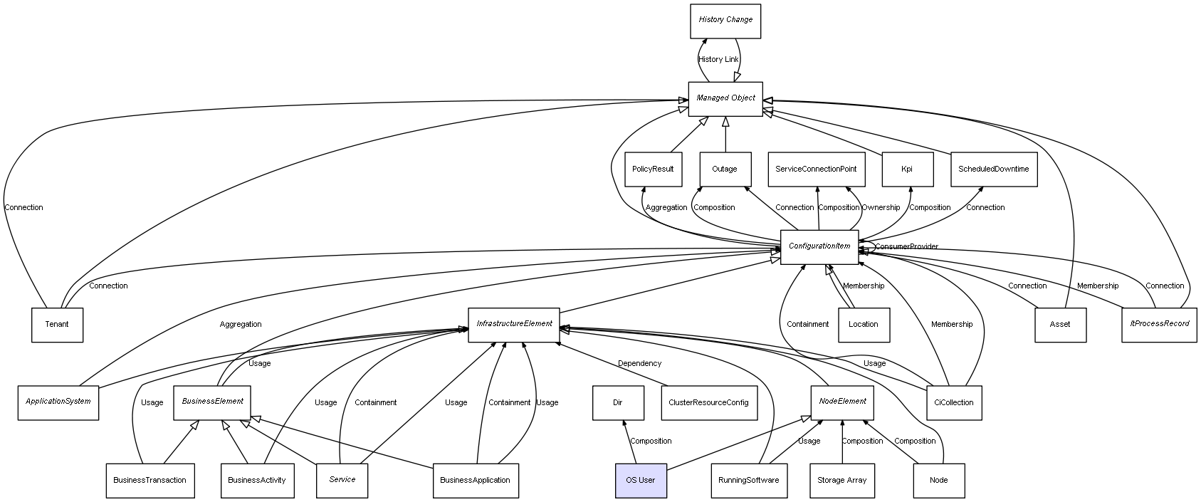 | ConfigurationItem | ServiceConnectionPoint | Composition | Represents a relation between 2 objects where one is contained within the other, and the included object can not exist without its container. Therefore, when the container is deleted, all its contained object will be automatically removed |