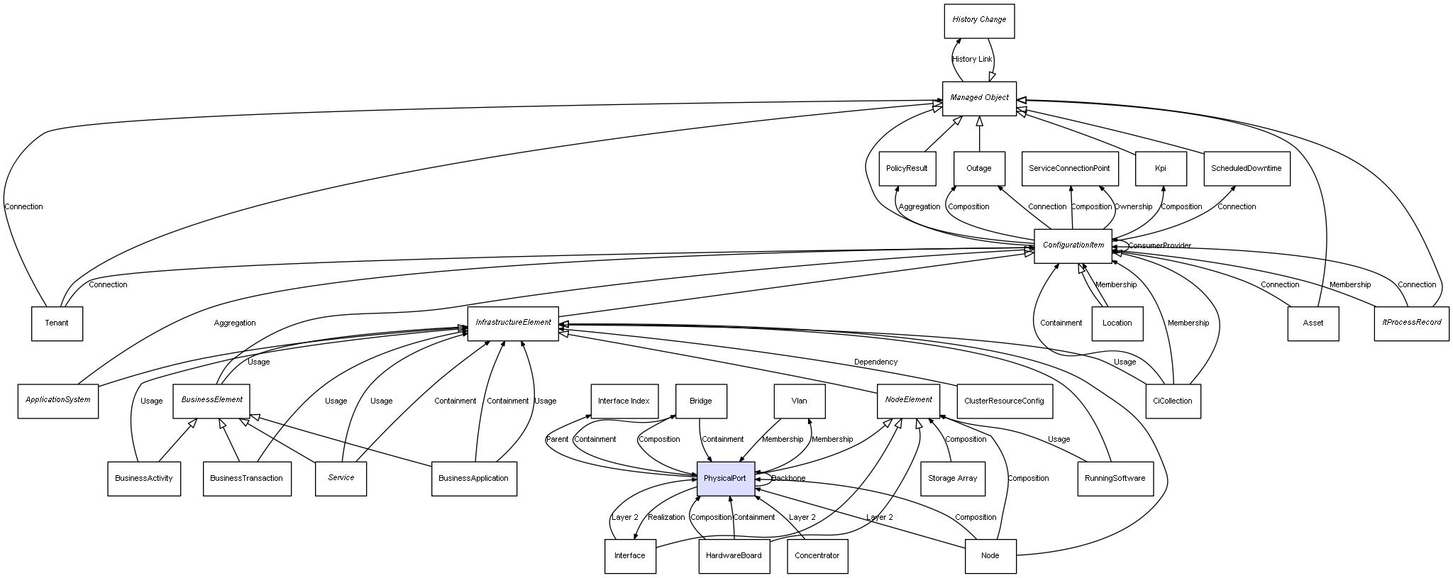 | Node | PhysicalPort | Composition | Represents a relation between 2 objects where one is contained within the other, and the included object can not exist without its container. Therefore, when the container is deleted, all its contained object will be automatically removed |