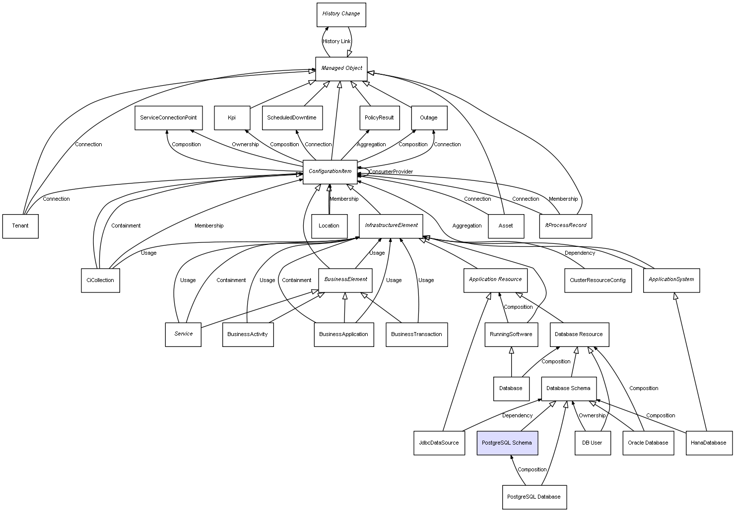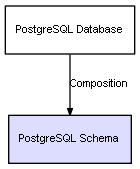 | PostgreSQL Database | PostgreSQL Schema | Composition | Represents a relation between 2 objects where one is contained within the other, and the included object can not exist without its container. Therefore, when the container is deleted, all its contained object will be automatically removed |