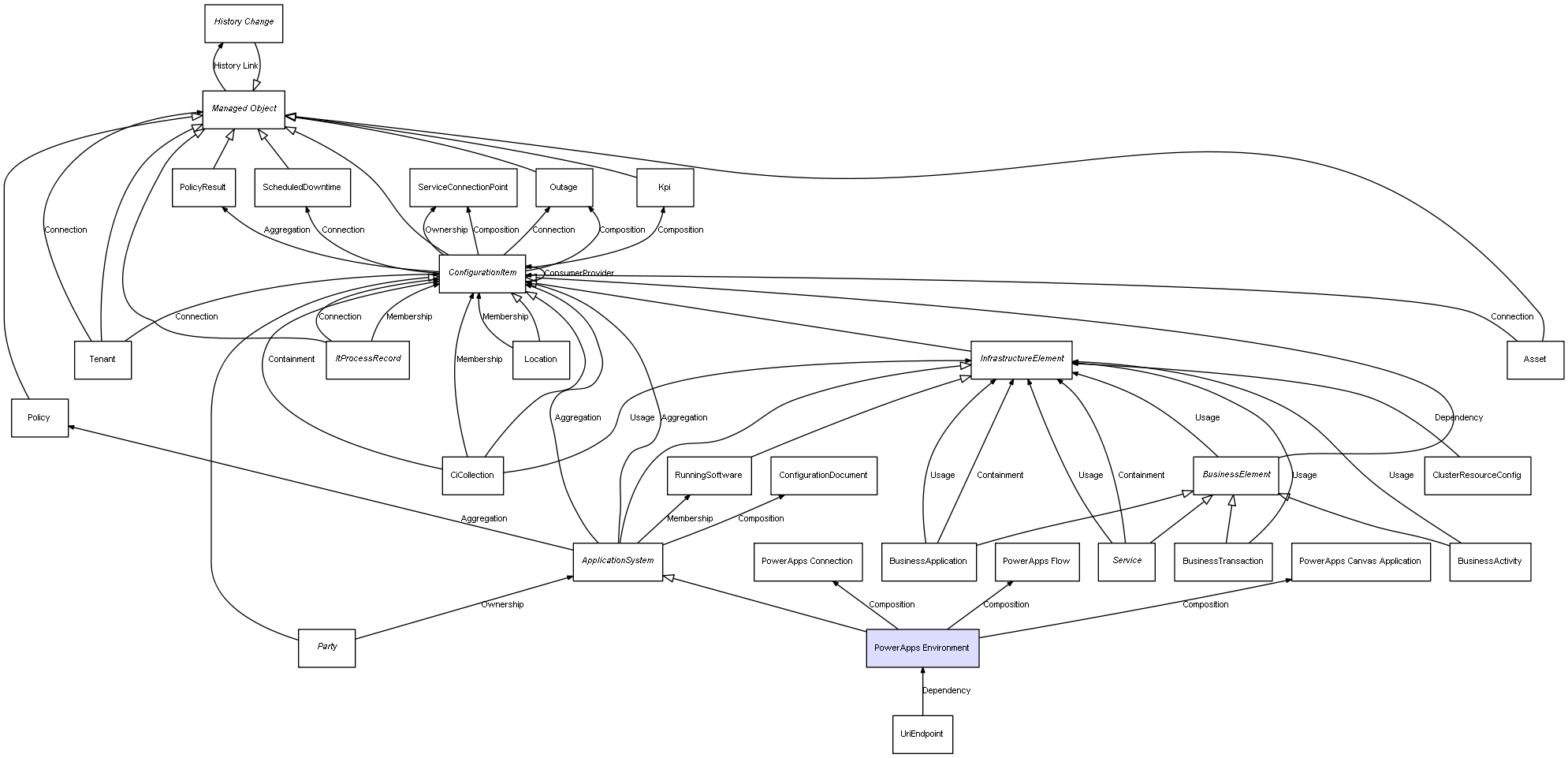 | PowerApps Environment | PowerApps Connection | Composition | Represents a relation between 2 objects where one is contained within the other, and the included object can not exist without its container. Therefore, when the container is deleted, all its contained object will be automatically removed |