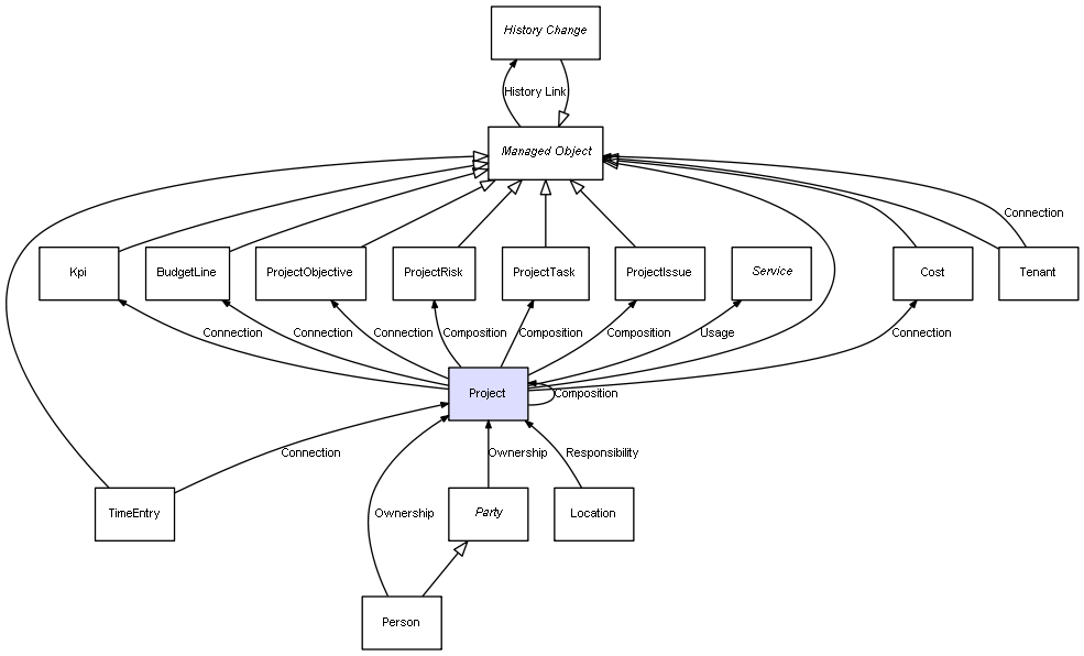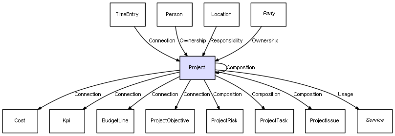 | Project | ProjectRisk | Composition | Represents a relation between 2 objects where one is contained within the other, and the included object can not exist without its container. Therefore, when the container is deleted, all its contained object will be automatically removed |