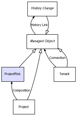 | Project | ProjectRisk | Composition | Represents a relation between 2 objects where one is contained within the other, and the included object can not exist without its container. Therefore, when the container is deleted, all its contained object will be automatically removed |