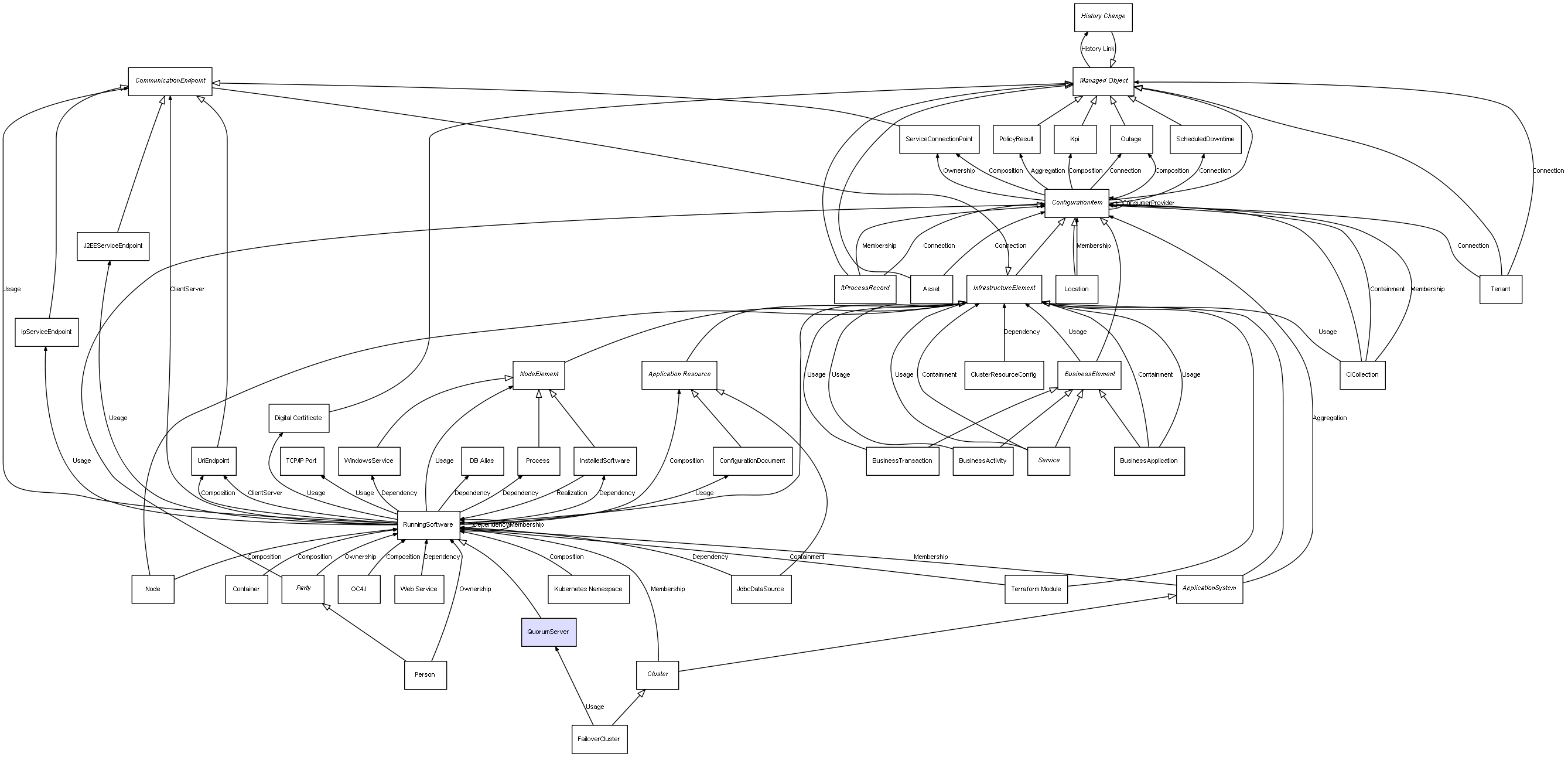 | ConfigurationItem | ServiceConnectionPoint | Composition | Represents a relation between 2 objects where one is contained within the other, and the included object can not exist without its container. Therefore, when the container is deleted, all its contained object will be automatically removed |