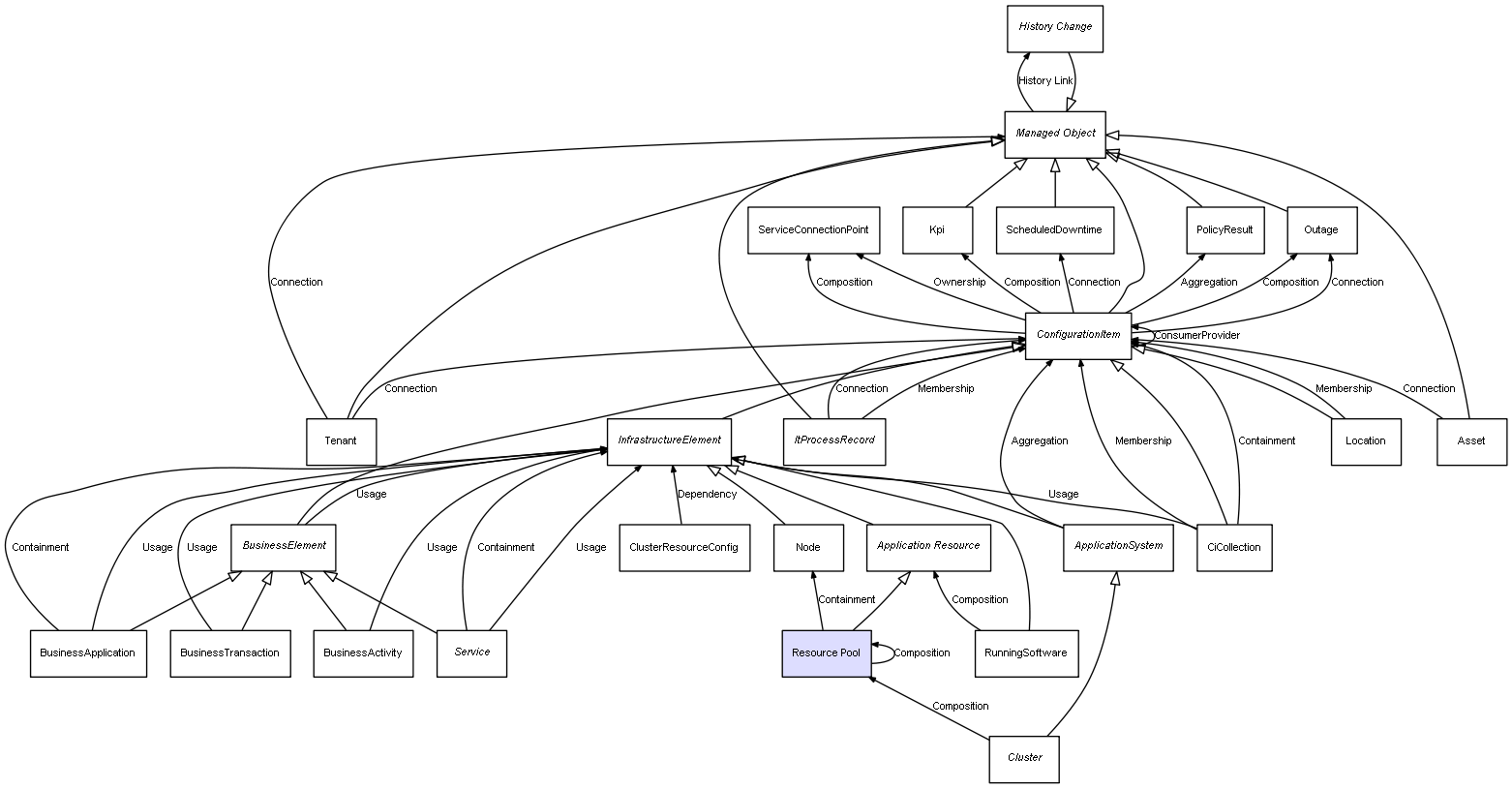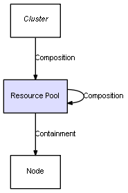 | Resource Pool | Resource Pool | Composition | Represents a relation between 2 objects where one is contained within the other, and the included object can not exist without its container. Therefore, when the container is deleted, all its contained object will be automatically removed |