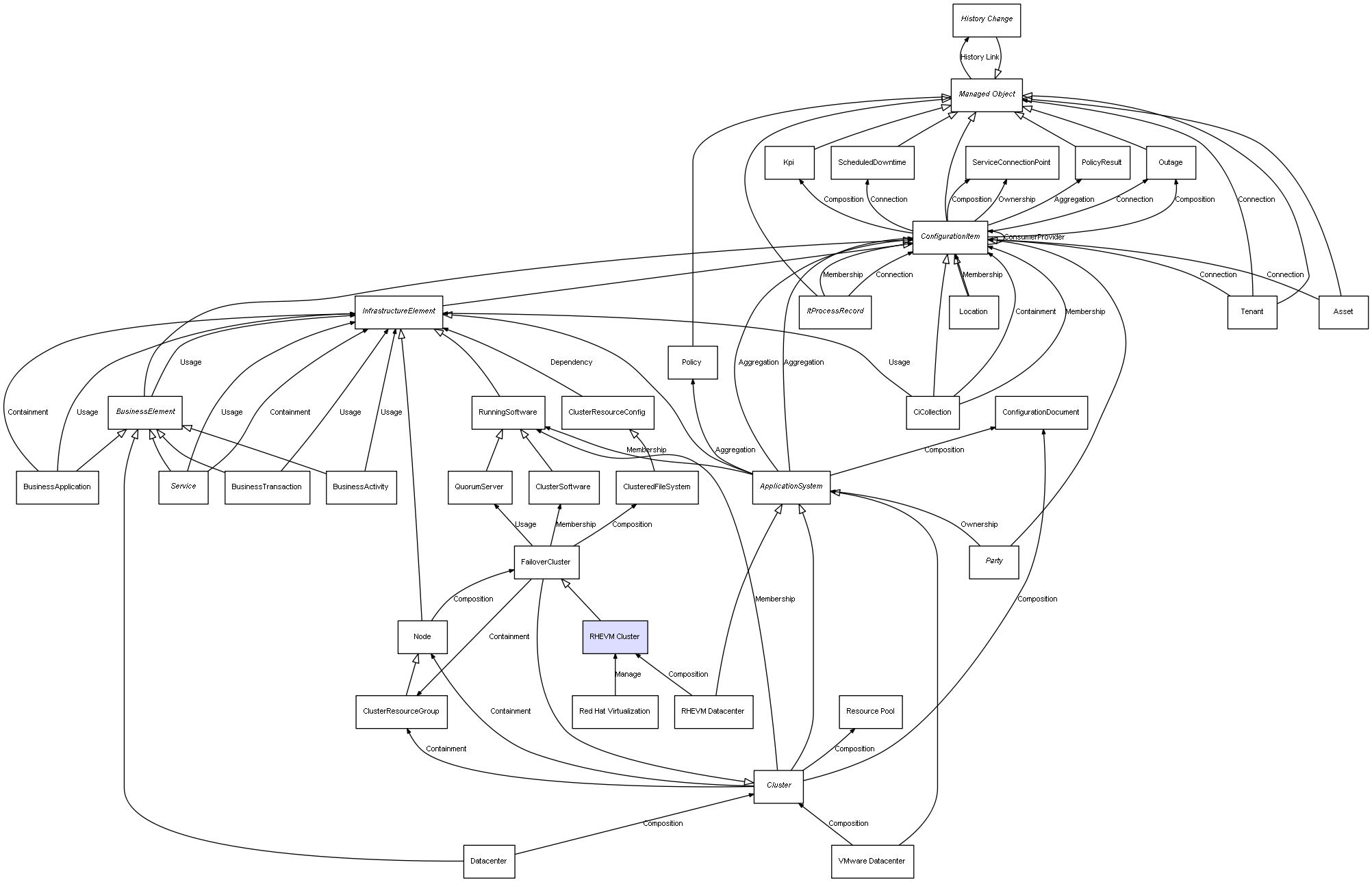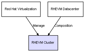 | RHEVM Datacenter | RHEVM Cluster | Composition | Represents a relation between 2 objects where one is contained within the other, and the included object can not exist without its container. Therefore, when the container is deleted, all its contained object will be automatically removed |